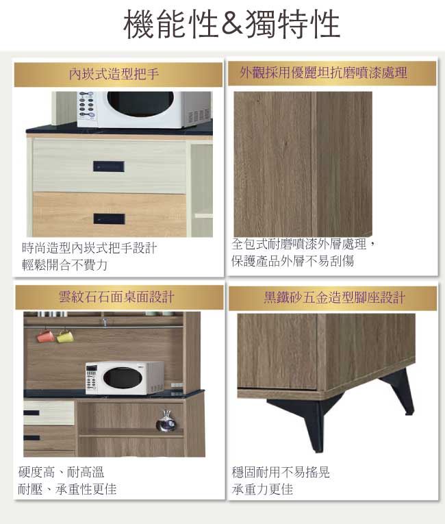 材質 | ◆產品名稱: 【綠家居】哈爾貝 三門三抽4尺雲紋石面餐櫃組合(二色可選) 尺寸:(寬)121x(深)41x(高)192/公分 ◆材質: 材質:防蛀木心板+黑鐵砂腳座+五金滑軌結構+12mm雲紋石面板+防夾手緩衝門片五金 噴漆:防潮耐磨噴漆處理