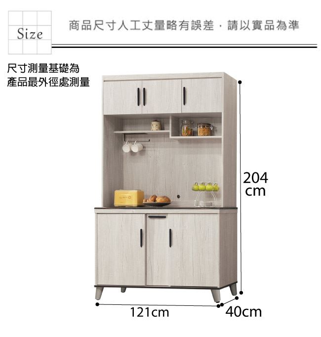 尺寸:(寬)121(深)40(高)204公分 ◆材質: 材質:防蛀木心板+防潮實木腳座+防夾手緩衝門片五金+12mm雲紋石面桌面板 噴漆:防潮耐磨噴漆處理