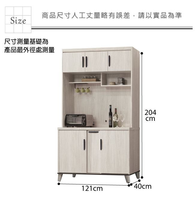 尺寸:(寬)121(深)40(高)204公分 ◆材質: 材質:防蛀木心板+防潮實木腳座+防夾手緩衝門片五金 噴漆:防潮耐磨噴漆處理