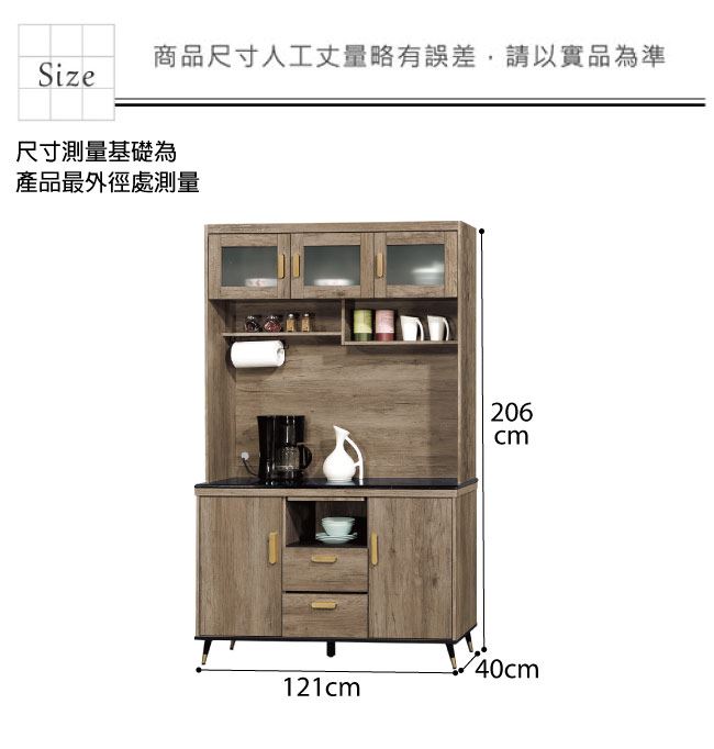 低餐櫃尺寸:(寬)121(深)40(高)206公分 ◆材質: 材質:防蛀木心板+防銹黑漆鍍烙腳座+五金滑軌結構+12mm雲紋石面桌面板 噴漆:防潮耐磨噴漆處理