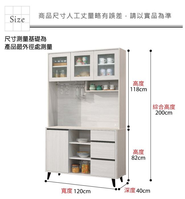 材質 | ◆產品名稱:【綠家居】魁北克4尺四門三抽高餐櫃/收納櫃組合 尺寸:(寬)120x(深)40(高)200公分 ◆材質: 材質:防蛀木心板+防鏽黑漆五金腳座+五金滑軌結構 噴漆:防潮耐磨噴漆處理