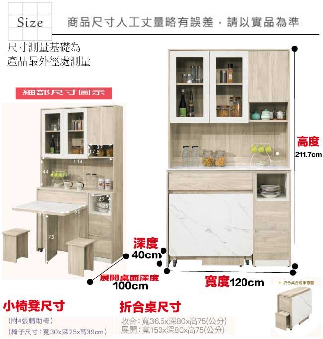 材質 | ◆產品名稱:【綠家居】羅娜岩板4尺多功能高餐桌櫃組合(拉合餐桌+餐櫃) 餐櫃尺寸:(寬)120x(深)40(高)211.7公分 折合餐桌(含四張椅凳) 打開尺寸:(寬)36.5x(深)80(高)75公分 收合尺寸:(寬)150x(深)80(高)75公分 ◆材質: 材質:防蛀木心板+防潮耐磨腳座+防夾手緩衝門片五金+五金滑軌結構+12mm高硬度岩板桌面板+仿大理石紋木質桌面板 噴漆:防潮耐磨噴漆處理