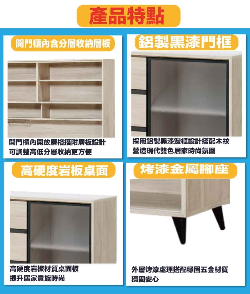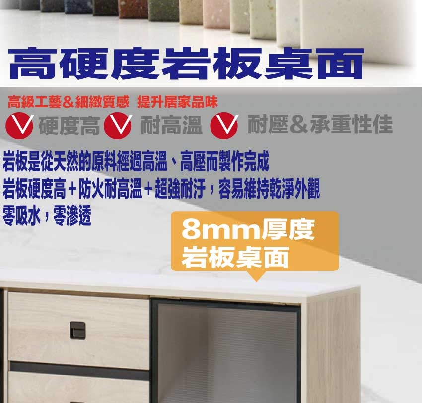 採用防蛀木心板+烤漆五金腳座+五金滑軌結構+8mm高硬度岩板桌面板+鋁製門框+霧面強化玻璃等安心材質製造