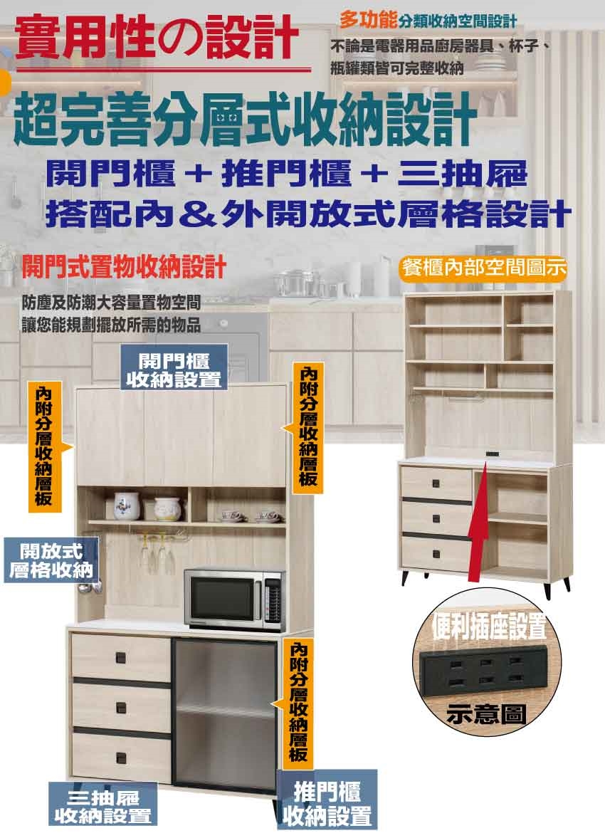 搭配採用開門櫃&推門櫃+三抽屜+內外開放層格等收納空間設計
