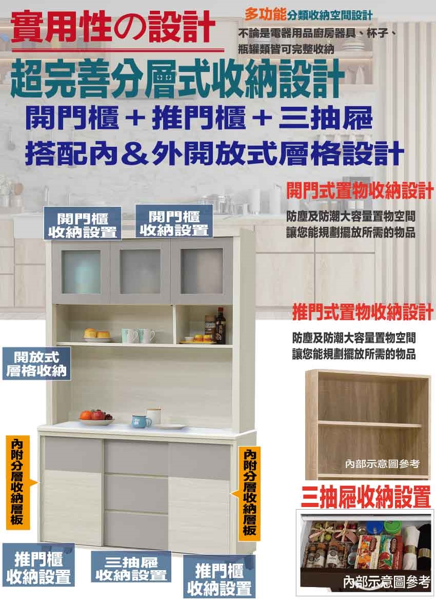 搭配採用開門櫃&推門櫃+三抽屜+內外開放層格等收納空間設計