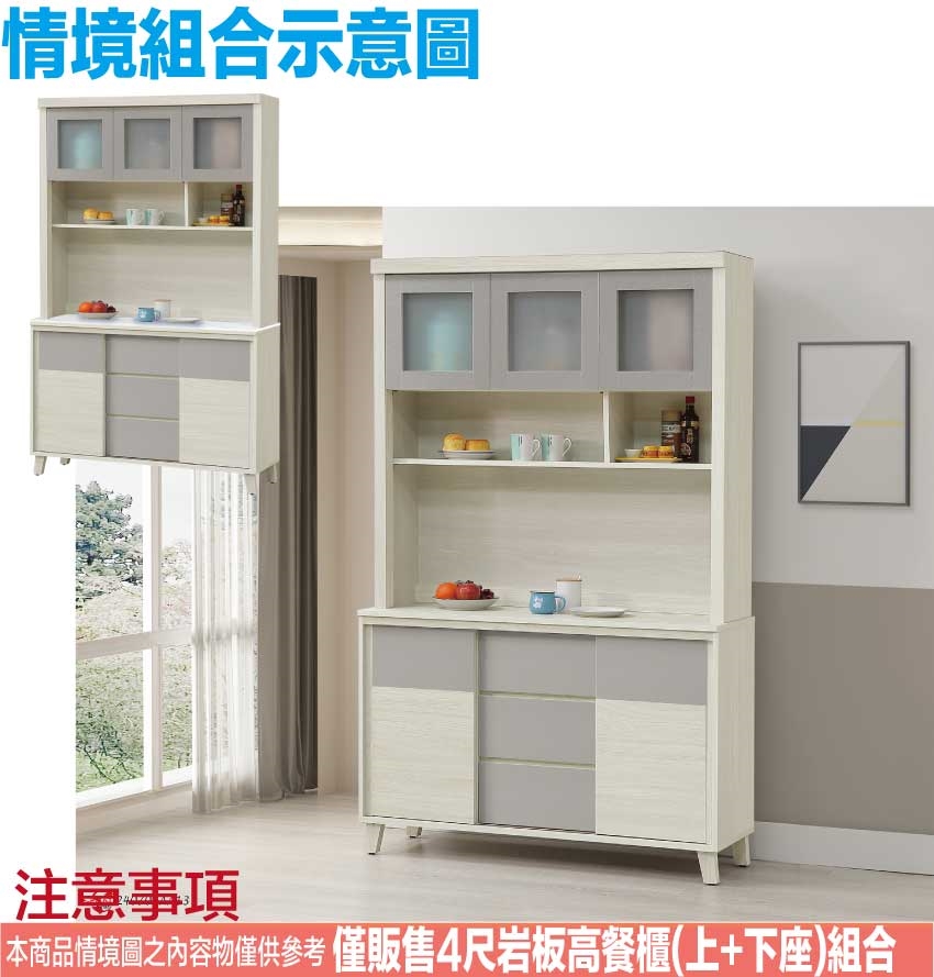 ★偏遠地區需額外加收運費,下標請先問與答詢問★ ★下訂前注意 由於商品流動較快,下訂前請先詢問是否有貨在下訂喔~★ 【綠家居】泰勒曼4尺岩板多功能高餐櫃組合 木紋雙色系+安心材質製造,使用放心+搭配居家更便利,採用防蛀木心板+實木防刮腳座+五金滑軌結構+防夾手緩衝門片五金+防潮灰色面板+8mm高硬度岩板桌面板等安心材質製造 ,外層採用防潮耐磨噴漆處理搭配採用開門櫃&推