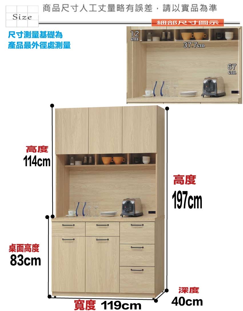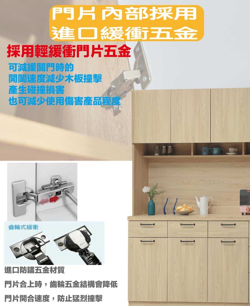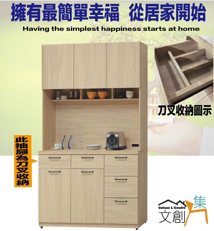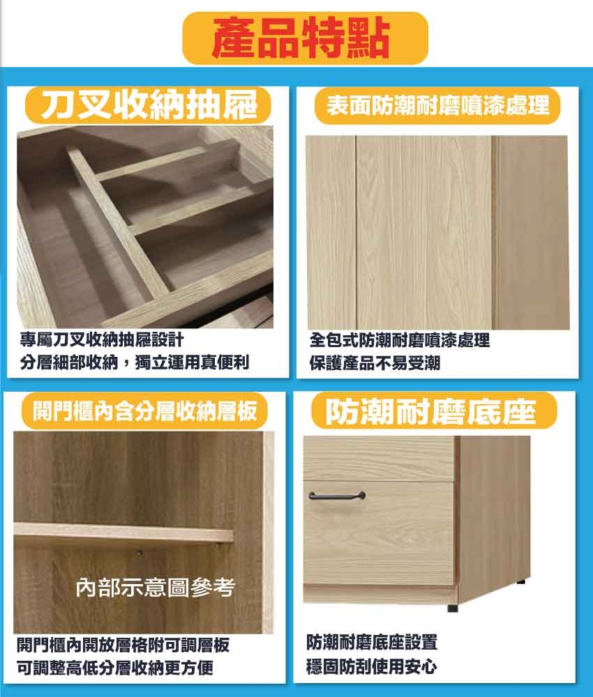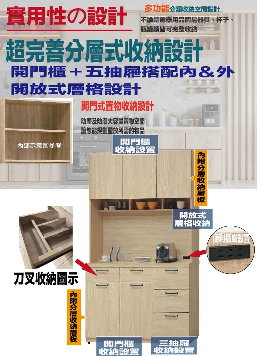 搭配採用開門櫃+五抽屜(含刀叉收納抽)+內&外開放層格等收納空間設計
