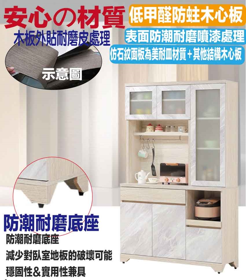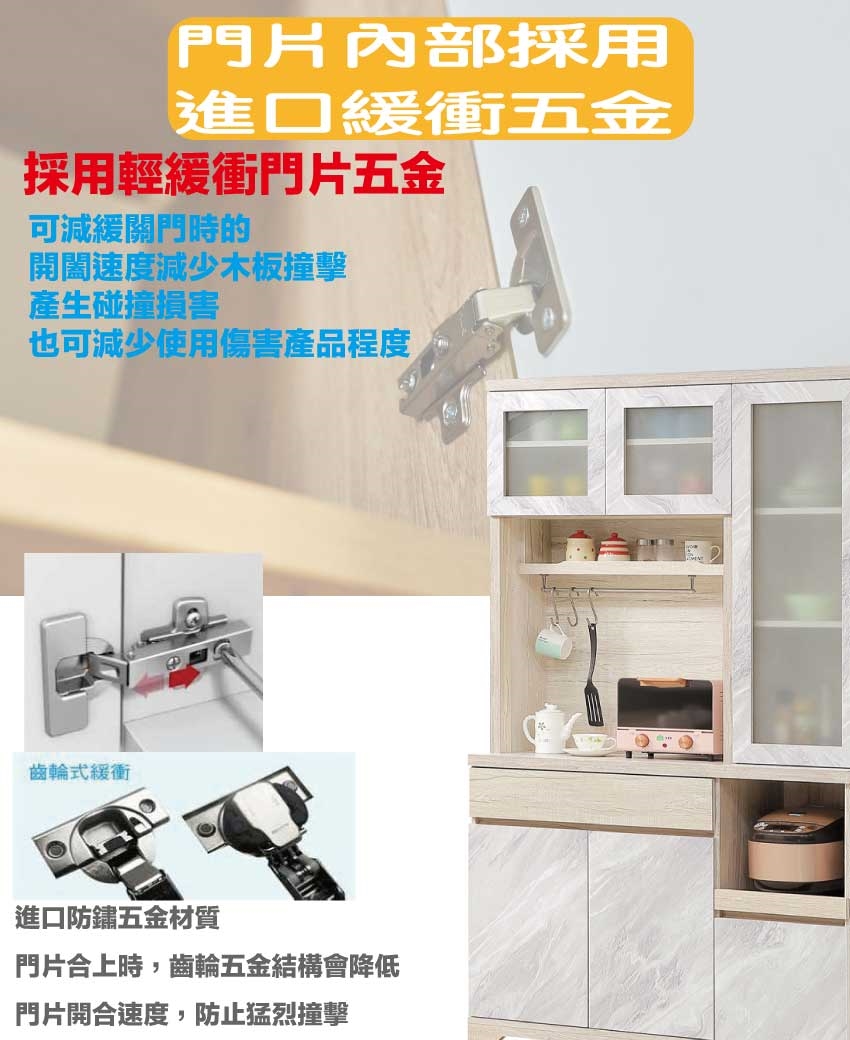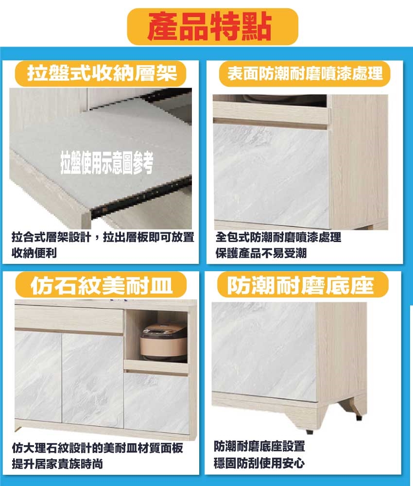 材質:防蛀木心板+五金滑軌結構+防刮耐磨腳座+仿石紋耐磨美耐皿材質面板+防夾手緩衝門片五金
