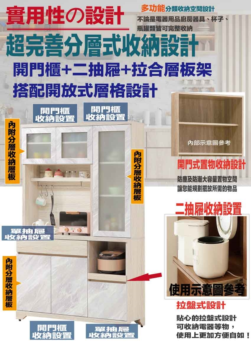 搭配採用開門櫃+二抽屜+內&外開放層格+拉盤層架等收納空間設計