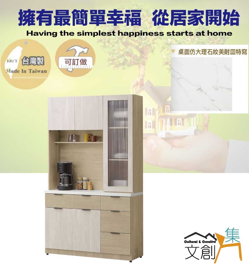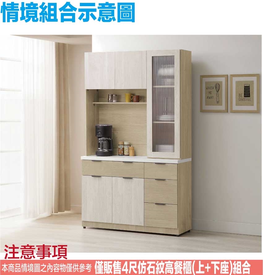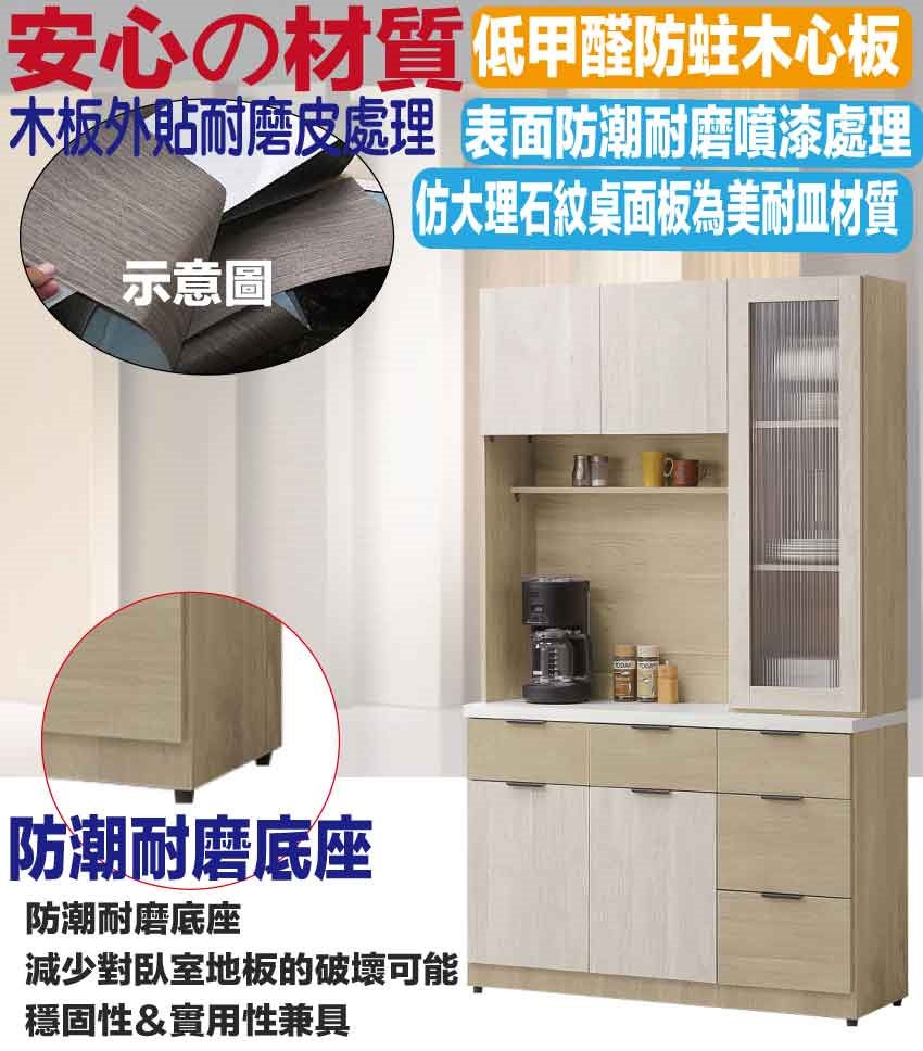 ★偏遠地區需額外加收運費,下標請先問與答詢問★ ★下訂前注意 由於商品流動較快,下訂前請先詢問是否有貨在下訂喔~★ 【綠家居】蘿克4尺五門五抽高餐櫃組合 現代雙色系+安心材質製造,使用放心+搭配居家更便利,採用防蛀木心板+防潮潮耐磨底座+五金滑軌結構+5mm長虹直紋PC耐力板+仿大理石紋耐磨美耐皿材質桌面板等安心材質製造 ,外層採用防潮耐磨噴漆處理搭配採用開門櫃+五抽屜+內&外開放層格等收納空間設計,全由專人配送到家,專業安心服務,替你省下更多時間!