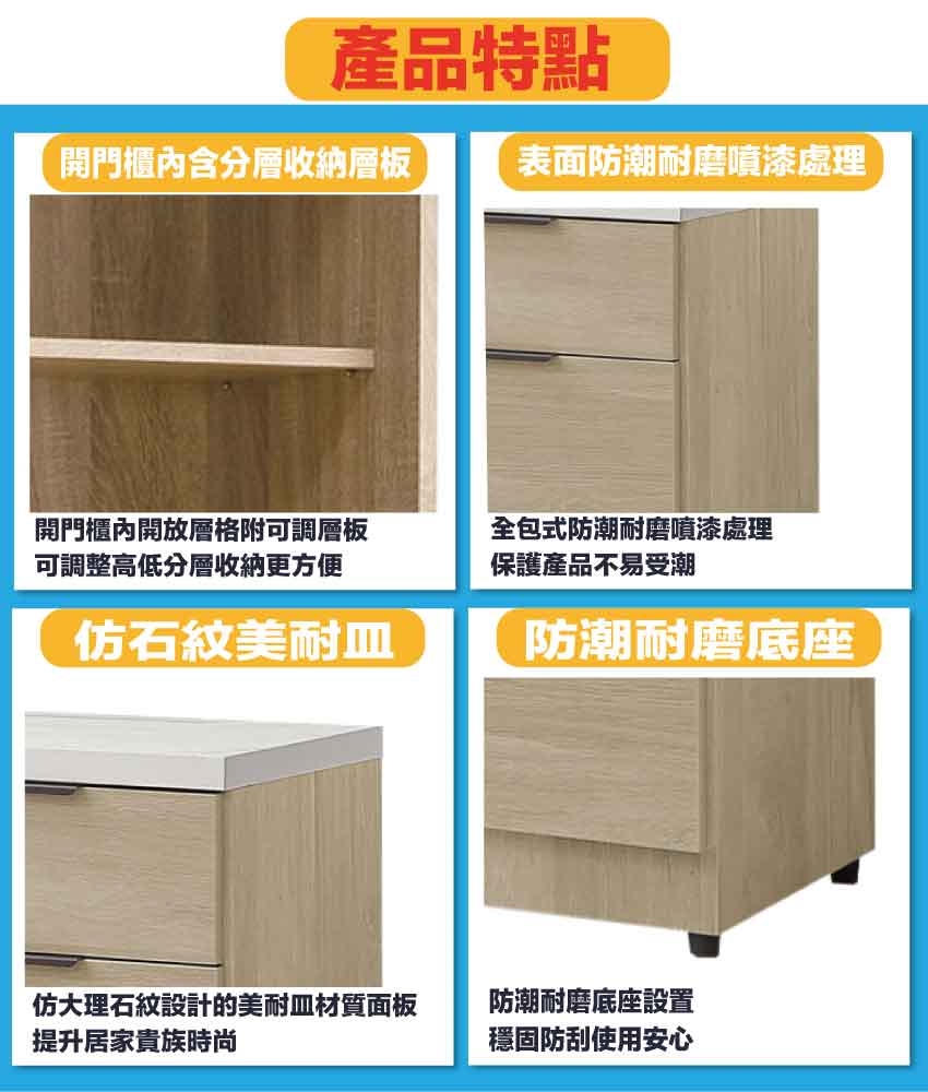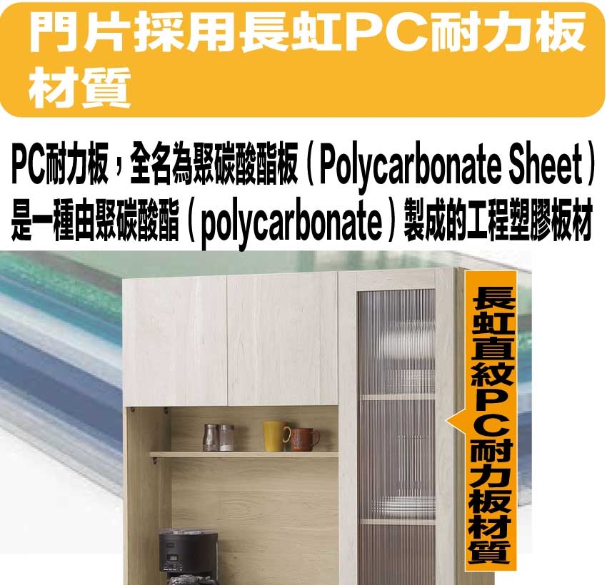 材質:防蛀木心板+防潮耐磨底座+五金滑軌結構+5mm長虹直紋PC耐力板+仿大理石紋耐磨美耐皿材質桌面板+防夾手緩衝門片五金