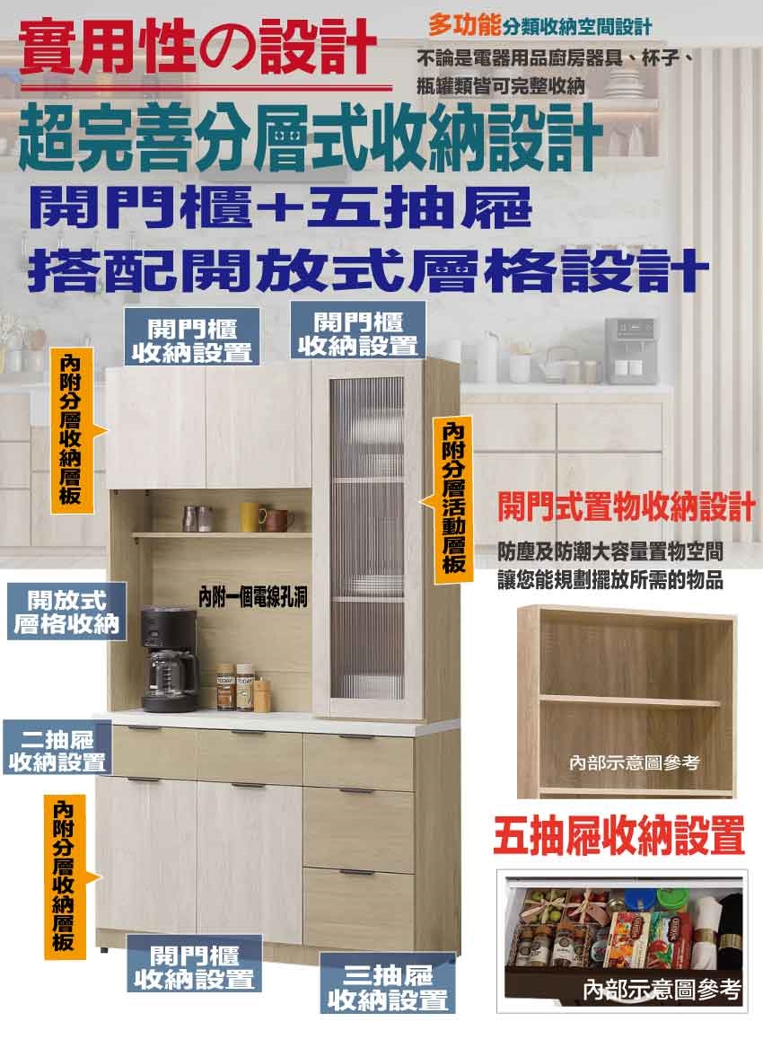 搭配採用開門櫃+五抽屜+內&外開放層格等收納空間設計