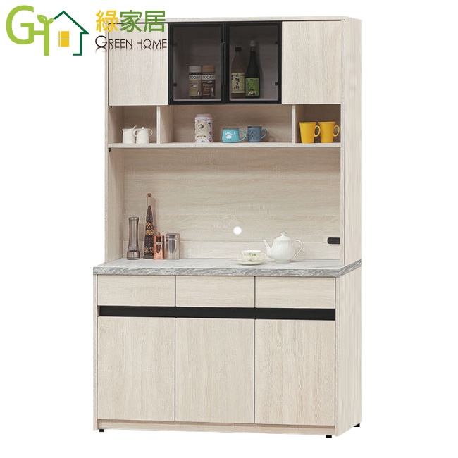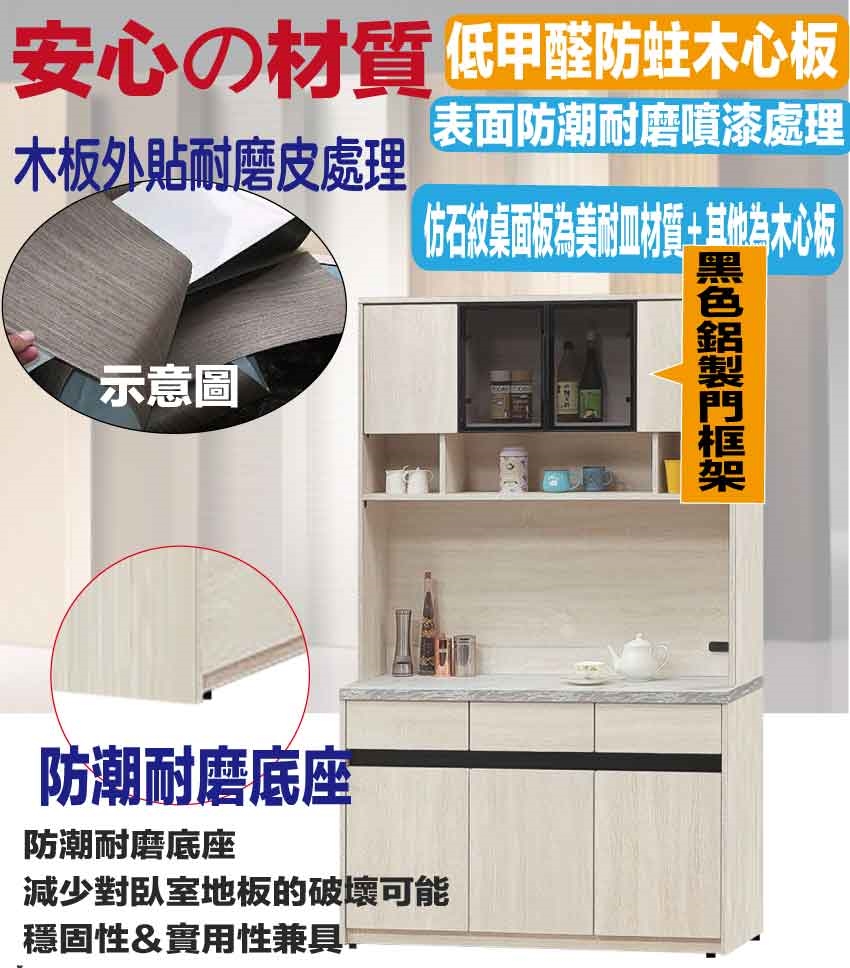 ★偏遠地區需額外加收運費,下標請先問與答詢問★ ★下訂前注意 由於商品流動較快,下訂前請先詢問是否有貨在下訂喔~★ 【綠家居】達斯4尺鋁框玻璃高餐櫃組合 木紋雙色系+現代簡約風格+安心材質製造,使用放心+搭配居家更便利,整體採用防蛀木心板+防潮耐磨腳座+防夾手緩衝五金+五金滑軌結構+耐磨美耐皿仿大理石紋桌面板+黑色鋁製框架+強化玻璃門片等材質製造搭配外層採用優莉坦耐磨全包式噴漆處理 ,採用開門櫃+三抽屜+內&外開放層格等收納空間設計,全由專人配送到家,專業安心服務,替你省下更多時間!