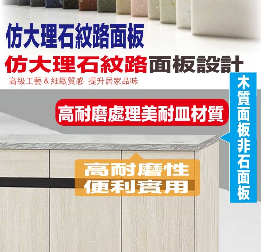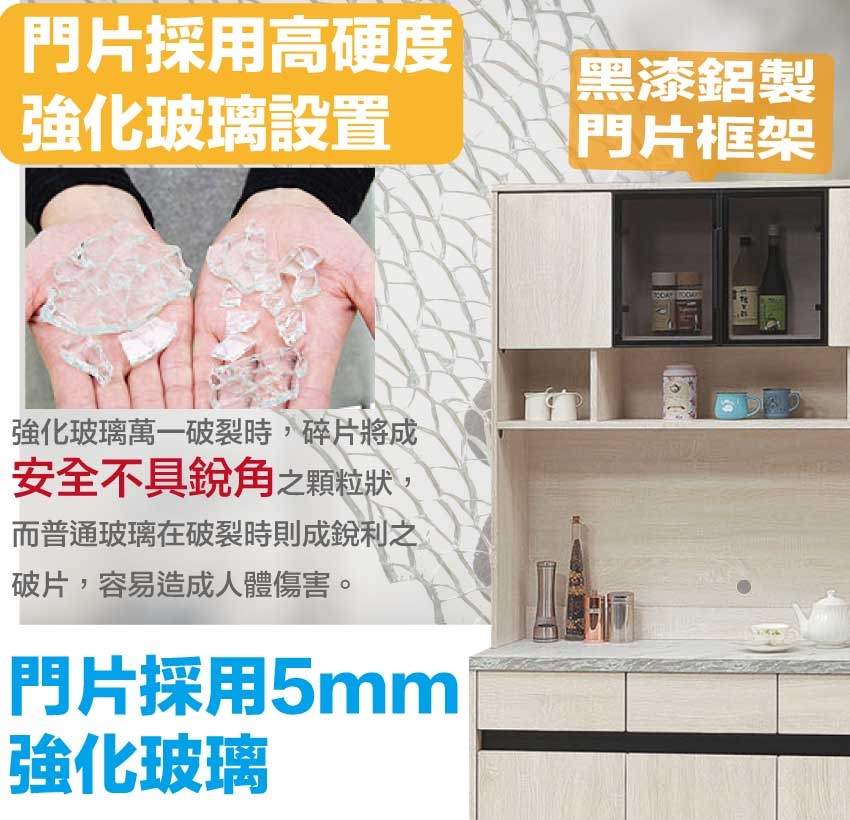 材質:防蛀木心板+防潮耐磨底座+防夾手緩衝五金+五金滑軌結構+黑色鋁製框架+強化玻璃門片+耐磨美耐皿仿大理石紋桌面板