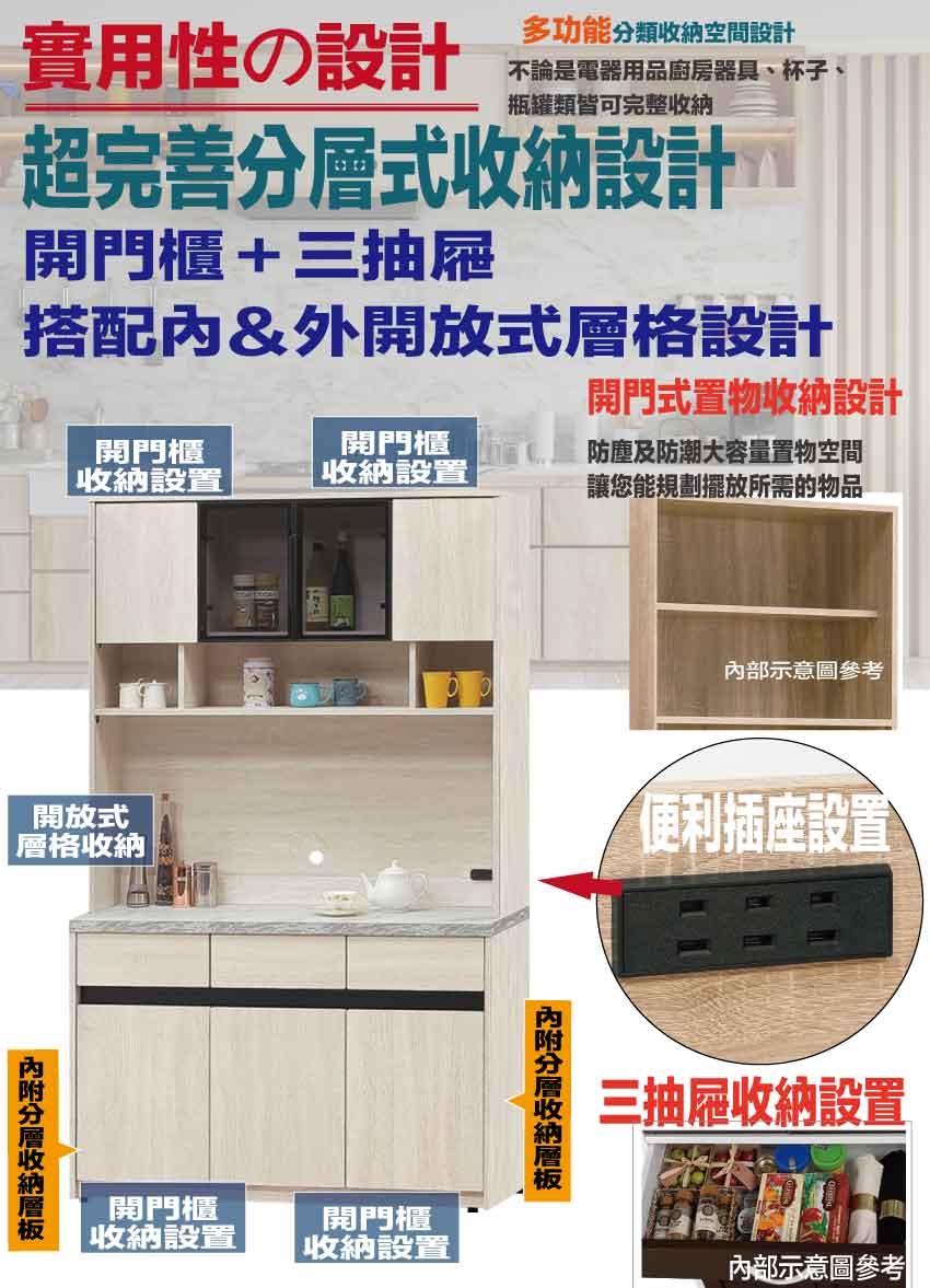 採用開門櫃+三抽屜+內&外開放層格等收納空間設計