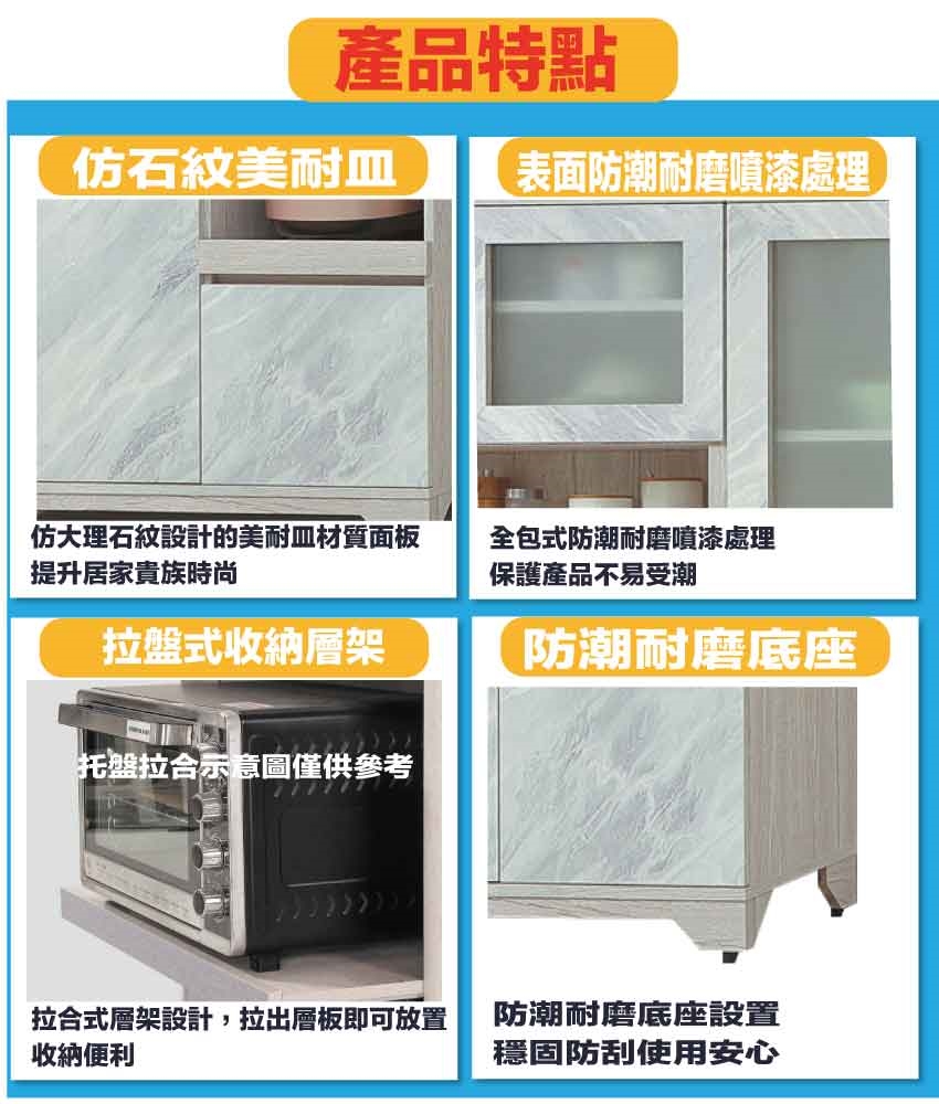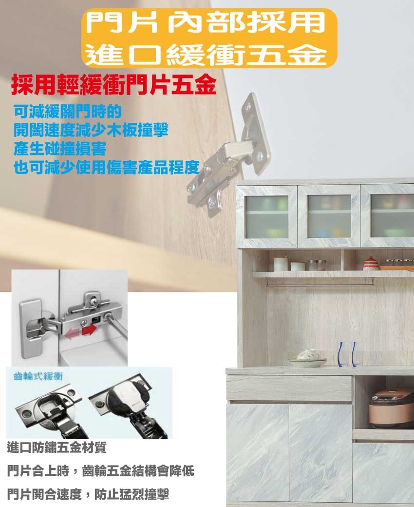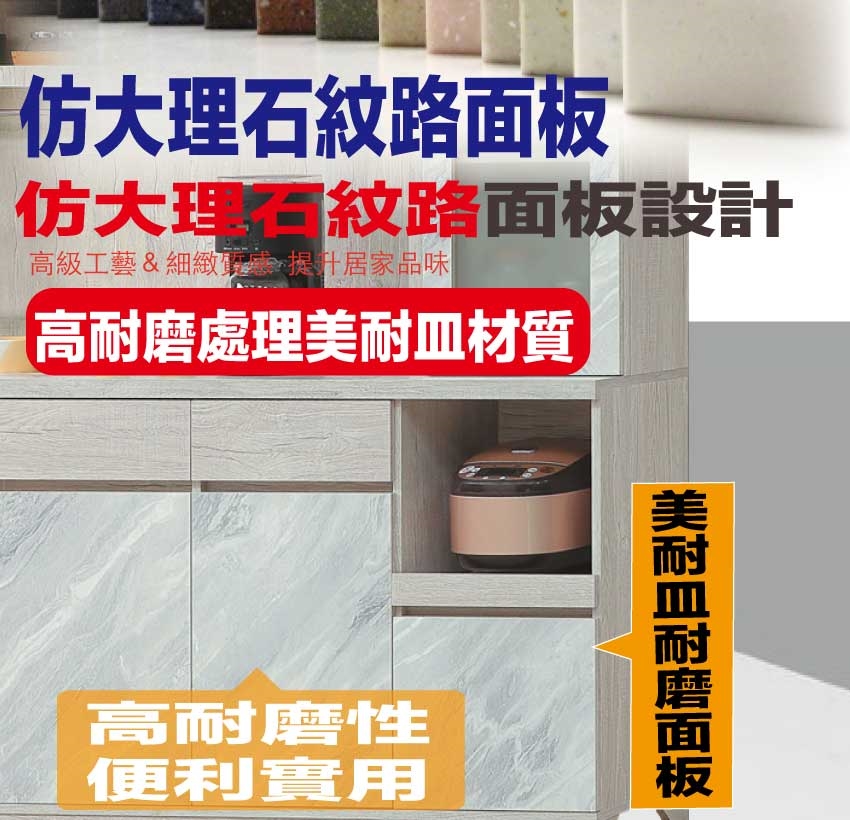 材質:防蛀木心板+防潮耐磨底座(可調高低水平)+仿大理石紋路耐磨美耐皿面板+防夾手緩衝門片五金 -