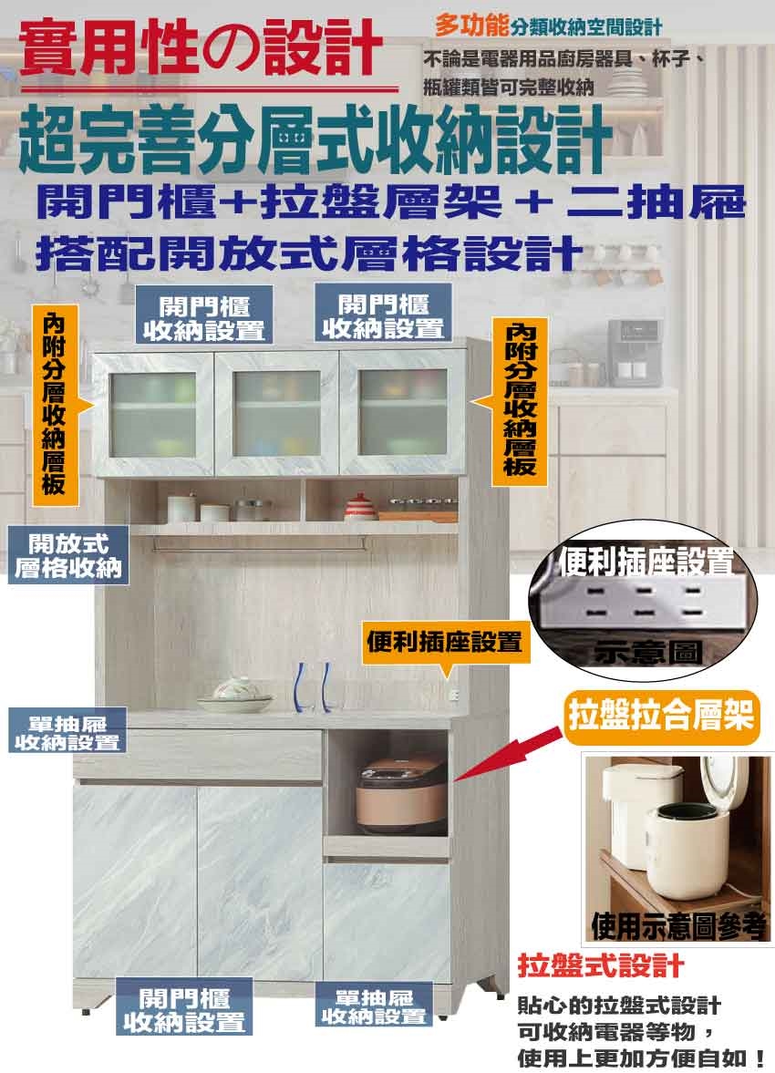 採用開門櫃+二抽屜+拉盤式層架+內開放層格等收納空間設計
