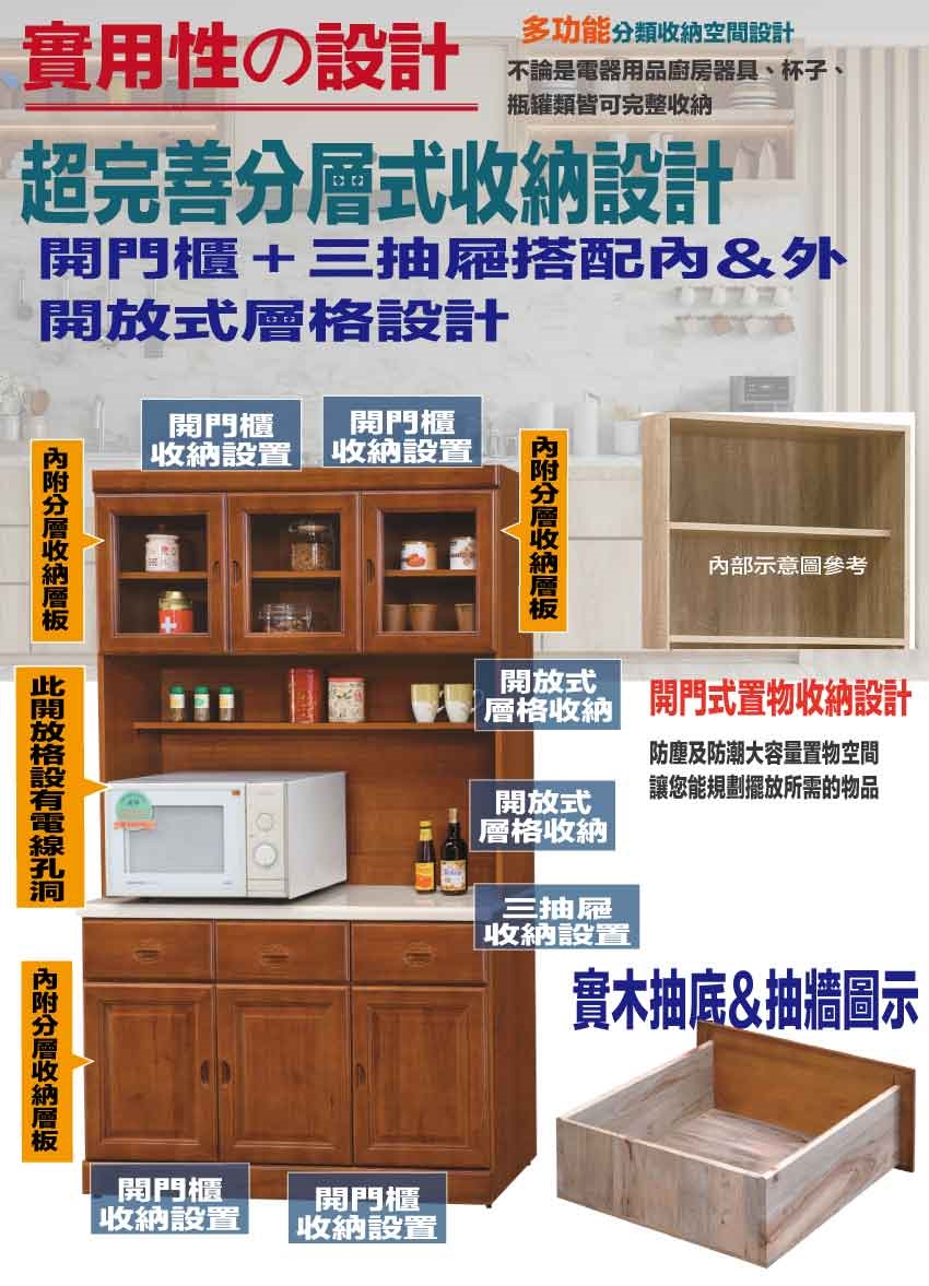 採用開門櫃+三抽屜+內&外開放層格等收納空間設計