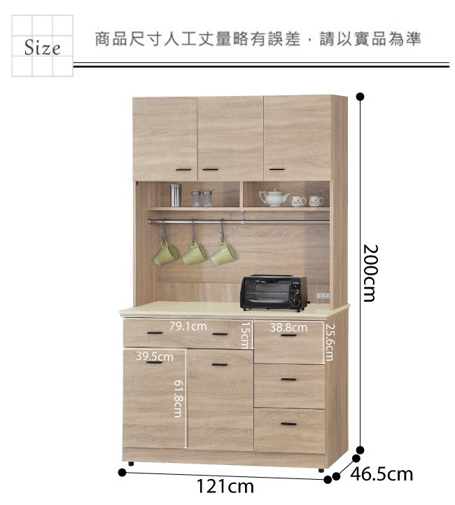 產品名稱:【綠家居】凱薩妮 橡木紋4尺雲紋石面收納櫃/餐櫃組合(上+下座) 產品尺寸:(寬)121x (深)46.5x(高)200/ 公分 產品材質: 材質:防蛀木心板 塗裝:優麗坦抗磨三層全包式塗漆塗裝 軌道:鋼珠滑軌 五金:防夾手緩衝門片五金 背板:釘附式美背處理 石面:2cm雲紋石面商品編號 | 尺寸 | 顏色 | 組裝方式 |