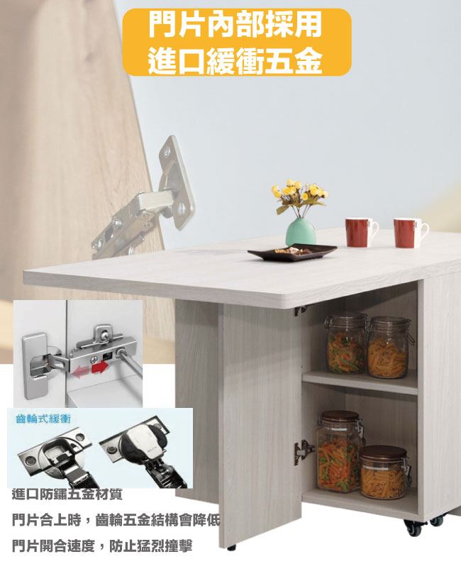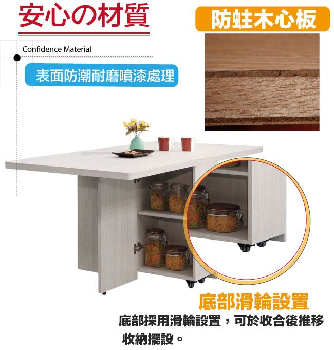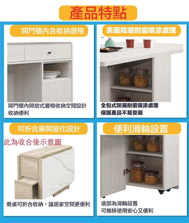 商品 介紹 | 【綠家居】溫斯5.6尺單門折合式餐桌 白榆木紋色系+現代簡約風格+安心材質製造,整體採用防蛀木心板+防潮耐磨腳座+防夾手緩衝門片五金+便利滑輪設置(折合桌)等安心材質製造,產品外層採用防潮耐磨噴漆處理搭配採用開門櫃+開放式層格等收納空間設計,全由專人配送到家,專業安心服務,替你省下更多時間! 【商品特色】 白榆木紋色系+現代簡約風格+安心材質製造,使用放心+搭配居家更便利 折合桌可展開使用,折合桌不用時可收合變化收納,讓居家空間最大化 採用防蛀木心板+防潮耐磨腳座+防夾手緩衝門片五金+便利滑輪設置(折合桌)等安心材質製造 產品外層採用防潮耐磨噴漆處理 採用開門櫃+開放式層格等收納空間設計 此商品不需要DIY組立,此商品為組立後之成品 品質保證、專業設計、貼心服務 全由專人配送到家,專業安心服務,替您省下更多時間 |