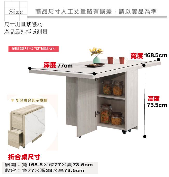 材質 | ◆產品名稱:【綠家居】溫斯5.6尺單門折合式餐桌 折合桌尺寸:展開(寬)168.5x(深)77(高)73.5公分 收合(寬)77x(深)78(高)73.5公分 ◆材質: 材質:防蛀木心板+防潮耐磨腳座+防夾手緩衝門片五金+便利滑輪設置(折合桌) 噴漆:防潮耐磨噴漆處理