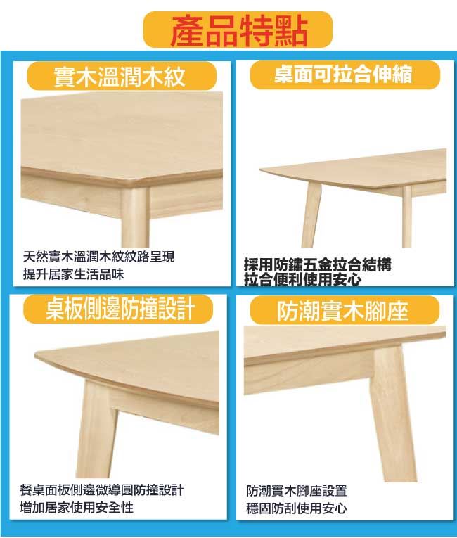 商品 介紹 | 【綠家居】德斯韋4尺可伸縮實木餐桌布餐椅組合(一桌四椅組合+120-150cm伸縮使用) 淺原木紋色系設計+一桌四椅組合+餐桌120-150cm伸縮使用+現代簡約風格+安心材質製造,使用放心+搭配居家更便利,整體採用橡膠木實木+MDF纖維板外貼實木皮處理+防潮實木腳座+防鏽拉合靜音導軌伸縮五金結構+橡膠木實木外貼實木皮+透氣棉麻布+高回彈泡棉+外層採用防潮耐磨噴漆處理等材質製造 ,全由專人配送到家,專業安心服務,替你省下更多時間! 【商品特色】 淺原木紋色系設計+一桌四椅組合+餐桌120-150cm伸縮使用+現代簡約風格+安心材質製造,使用放心+搭配居家更便利 餐桌可伸縮開合120-150cm寬度使用,簡易拉合安心穩固,提供您打造機能便利居家 橡膠木實木+MDF纖維板外貼實木皮處理+防潮實木腳座+防鏽拉合靜音導軌伸縮五金結構+橡膠木實木外貼實木皮+透氣棉麻布+高回彈泡棉+外層採用防潮耐磨噴漆處理等材質製造 此商品不需要DIY組立,此商品為組立後之成品 品質保證、專業設計、貼心服務 全由專人配送到家,專業安心服務,替您省下更多時間 |