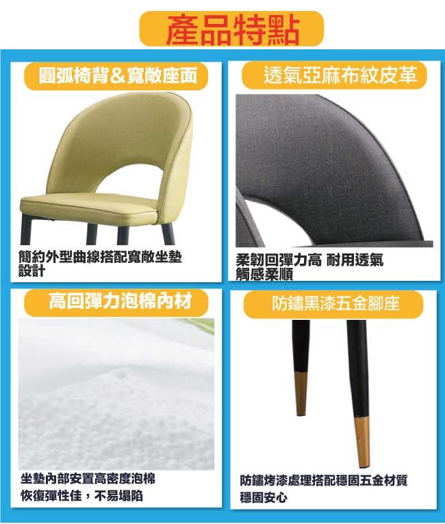 商品 介紹 | 【綠家居】瑪羅時尚布紋皮革餐椅二入組合(二色可選+二張餐椅組合販售出貨) 二色可選+二張餐椅組合販售出貨+現代簡約風格+安心材質製造,使用放心+搭配居家更便利,整體採用防鏽黑漆鐵製腳座+亞麻布紋透氣皮革+鐵製椅身底框+高回彈泡棉等材質製造 ,全由專人配送到家,專業安心服務,替你省下更多時間! 請注意:本賣場為二入餐椅組合販售,接獲訂單時出貨以二張餐椅組合為單位出貨 【商品特色】 二色可選+二張餐椅組合販售出貨+現代簡約風格+安心材質製造,使用放心+搭配居家更便利 防鏽黑漆鐵製腳座+亞麻布紋透氣皮革+鐵製椅身底框+高回彈泡棉等材質製造 此商品不需要DIY組立,此商品為組立後之成品 品質保證、專業設計、貼心服務 全由專人配送到家,專業安心服務,替您省下更多時間 |
