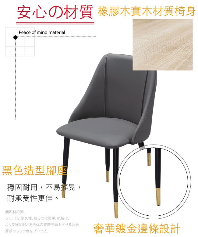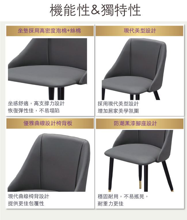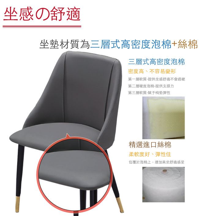 商品介紹 | 【綠家居】姆維亞 北歐灰貓抓皮革餐椅 材質採用松木實木椅身+耐刮貓抓皮革+-高密度高彈性泡棉+防潮黑漆&鍍金邊框腳座等安心材質,搭配現代歐風設計+北歐灰色系等設計。產品免組裝+全由專人配送到家,專業安心服務,替你省下更多時間! 【商品特色】 材質採用松木實木椅身+耐刮貓抓皮革+-高密度高彈性泡棉+防潮黑漆&鍍金邊框腳座等安心材質 搭配現代歐風設計+北歐灰色系等設計 此商品不需要自行組裝,專人組裝完成配送到府即可使用 品質保證、專業設計、貼心服務 全由專人配送到家,專業安心服務,替你省下更多時間 |