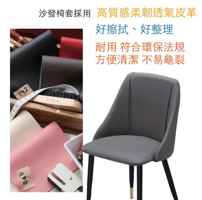 材質 | ◆產品名稱:【綠家居】 姆維亞 北歐灰貓抓皮革餐椅 尺寸: W(寬)51× D(深)45× H(高)87cm 材質: 松木實木椅身+耐刮貓抓皮革+-高密度高彈性泡棉+防潮黑漆&鍍金邊框腳座 組裝方式: 免組裝-專人送貨到府定位 |