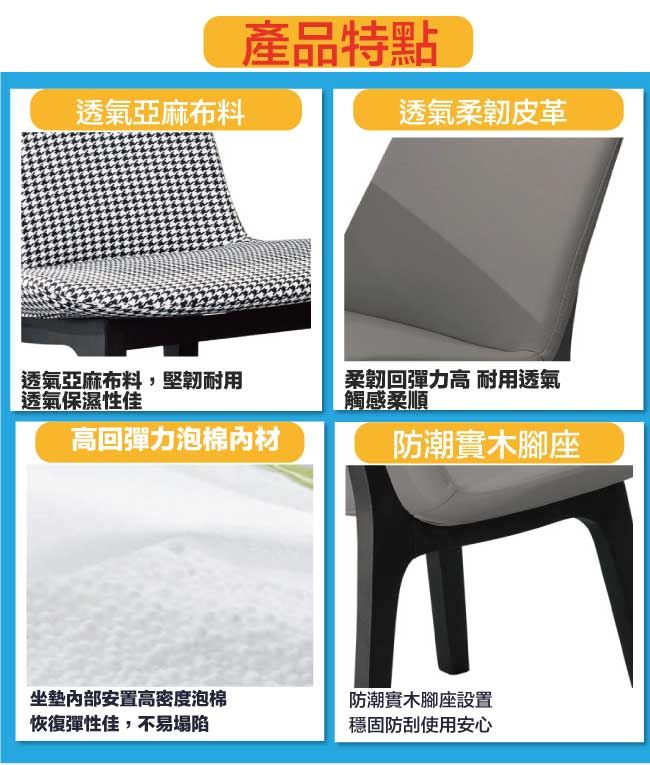 商品 介紹 | 【綠家居】瑪拉雅透氣皮革&亞麻布實木餐椅四入組合(二色可選+四張餐椅組合販售出貨) 二色可選+四張餐椅組合販售出貨+現代簡約風格+安心材質製造,使用放心+搭配居家更便利,整體採用白蠟木實木+防潮實木腳座+柔韌透氣皮革+透氣亞麻布+高回彈泡棉等材質製造 ,全由專人配送到家,專業安心服務,替你省下更多時間! 請注意:本賣場為四入餐椅組合販售,接獲訂單時出貨以四張餐椅組合為單位出貨 【商品特色】 二色可選+四張餐椅組合販售出貨+現代簡約風格+安心材質製造,使用放心+搭配居家更便利 白蠟木實木+防潮實木腳座+柔韌透氣皮革+透氣亞麻布+高回彈泡棉等材質製造 此商品不需要DIY組立,此商品為組立後之成品 品質保證、專業設計、貼心服務 全由專人配送到家,專業安心服務,替您省下更多時間 |