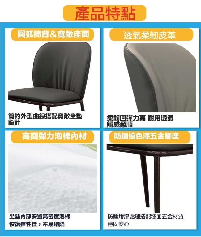 材質 | ◆產品名稱:【綠家居】雅迪透氣皮革餐椅四入組合(二色可選+四張餐椅組合販售出貨) 餐椅尺寸:(寬)44x(深)59x(高)82/公分 請注意:本賣場為四入餐椅組合販售,接獲訂單時出貨以四張餐椅組合為單位出貨 ◆材質: 材質:防鏽槍色漆鐵製腳座+透氣柔韌皮革+鐵製椅身底框+高回彈泡棉