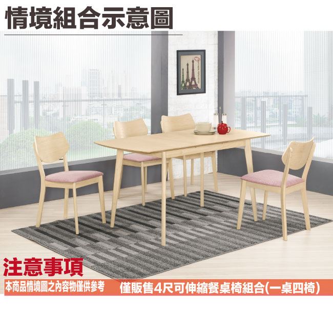 商品 介紹 | 【綠家居】德莉特4尺可伸縮實木餐桌布餐椅組合(一桌四椅組合+120-150cm伸縮使用) 淺原木紋色系設計+一桌四椅組合+餐桌120-150cm伸縮使用+現代簡約風格+安心材質製造,使用放心+搭配居家更便利,整體採用橡膠木實木+MDF纖維板外貼實木皮處理+防潮實木腳座+防鏽拉合靜音導軌伸縮五金結構+橡膠木實木外貼實木皮+透氣棉麻布+高回彈泡棉+外層採用防潮耐磨噴漆處理等材質製造 ,全由專人配送到家,專業安心服務,替你省下更多時間! 【商品特色】 淺原木紋色系設計+一桌四椅組合+餐桌120-150cm伸縮使用+現代簡約風格+安心材質製造,使用放心+搭配居家更便利 餐桌可伸縮開合120-150cm寬度使用,簡易拉合安心穩固,提供您打造機能便利居家 橡膠木實木+MDF纖維板外貼實木皮處理+防潮實木腳座+防鏽拉合靜音導軌伸縮五金結構+橡膠木實木外貼實木皮+透氣棉麻布+高回彈泡棉+外層採用防潮耐磨噴漆處理等材質製造 此商品不需要DIY組立,此商品為組立後之成品 品質保證、專業設計、貼心服務 全由專人配送到家,專業安心服務,替您省下更多時間 |