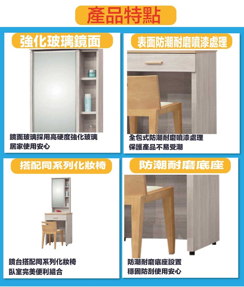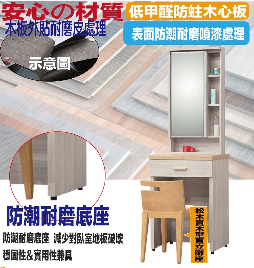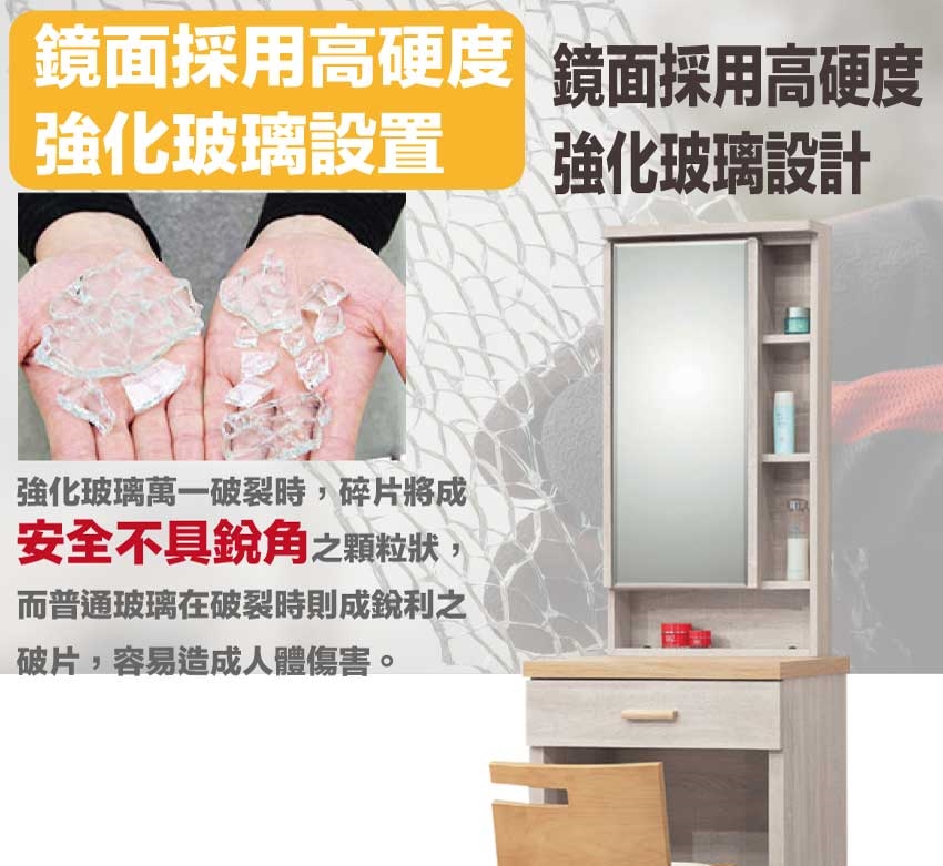 防蛀木心板+防潮耐磨底座+強化玻璃鏡面等安心材質製造