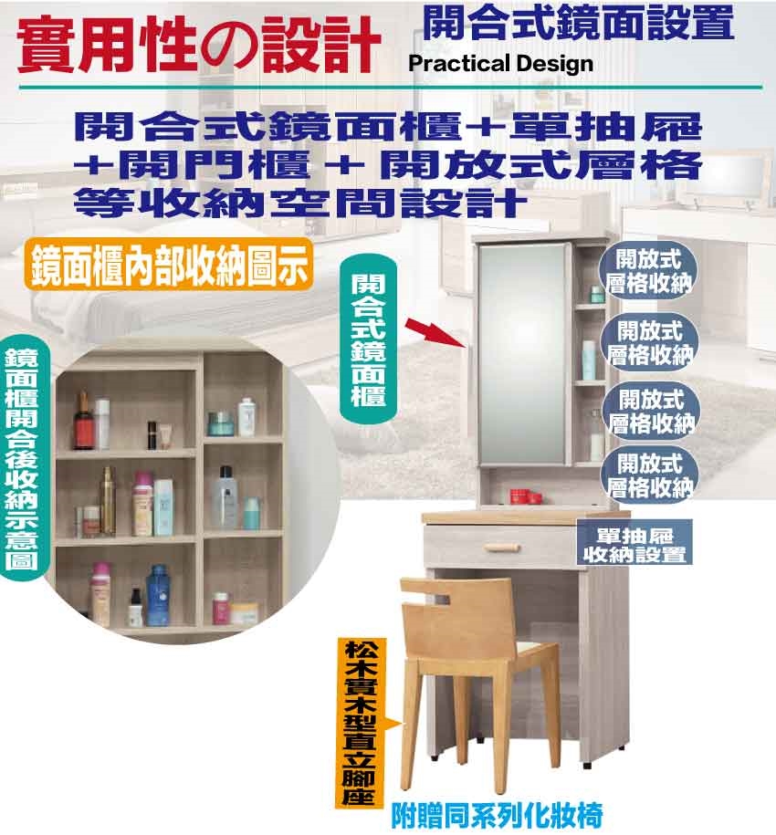 - ◆產品名稱:【綠家居】泰順2尺開合式鏡面鏡台組合(含化妝椅)