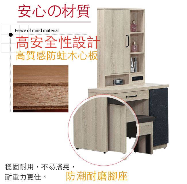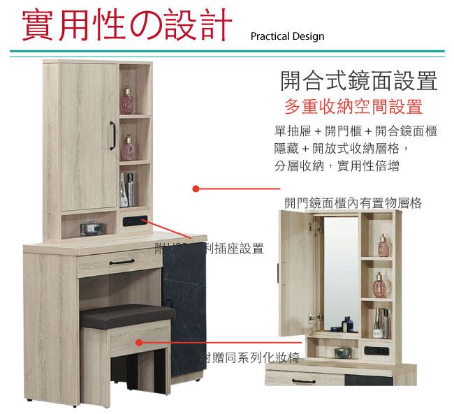 商品介紹 | 【綠家居】可倫坡 現代2.7尺開合式鏡台/化妝台(含化妝椅) 橡木紋色系+現代簡約風格+安心材質製造,鏡台整體採用防蛀木心板+五金滑軌結構+強化玻璃鏡面等安心材質製造,外層採用優利坦全包式耐磨噴漆塗處理搭配開合式鏡面+開門櫃+單抽屜+開放式&隱藏式收納等收納設計,全由專人配送到家,專業安心服務,替你省下更多時間! 【商品特色】 橡木紋色系+現代簡約風格+安心材質製造,使用放心+搭配居家更便利 鏡台採用防蛀木心板+五金滑軌結構+強化玻璃鏡面等安心材質製造 開合式鏡面+開門櫃+單抽屜+開放式&隱藏式收納等收納設計 此商品不需要DIY組立,此商品為組立後之成品 品質保證、專業設計、貼心服務 全由專人配送到家,專業安心服務,替您省下更多時間 |