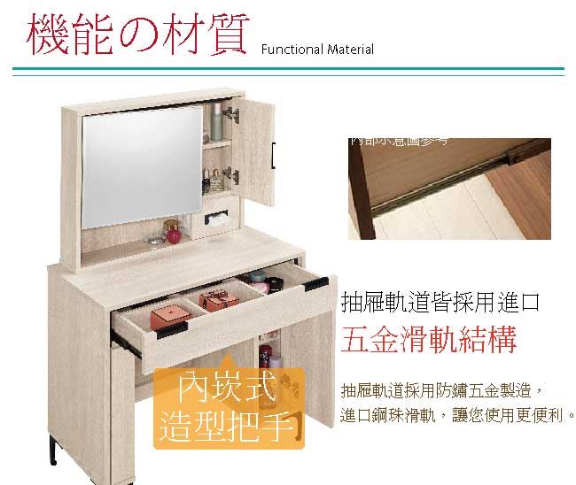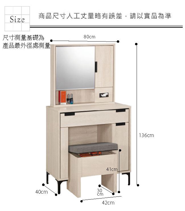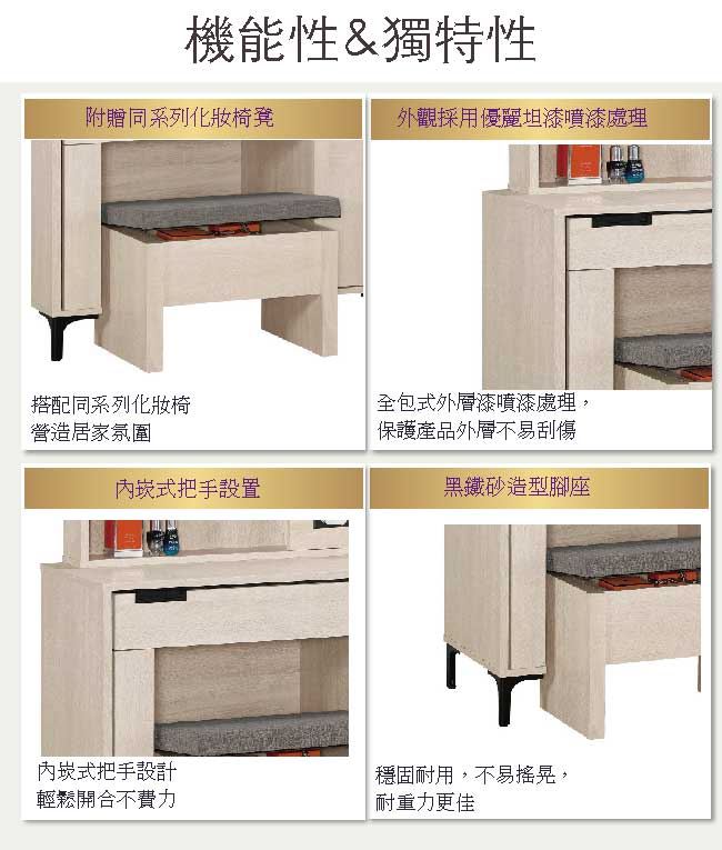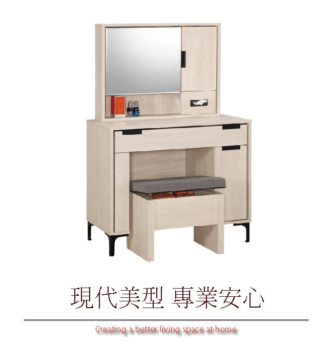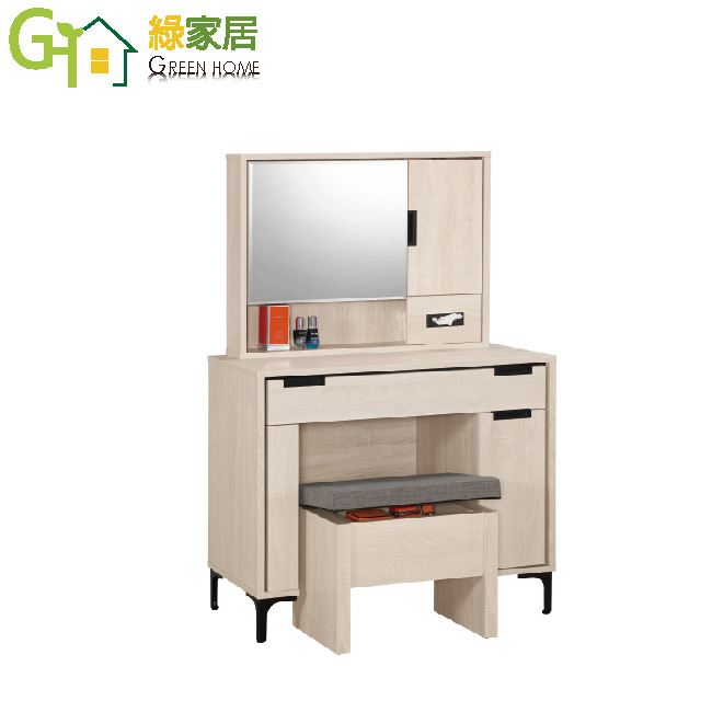商品介紹 | 【綠家居】柏麗 開合式2.7尺鏡台/化妝台組合(鏡台+化妝椅) 橡木紋色系+現代簡約風格+安心材質製造,鏡台整體採用防蛀木心板+五金滑軌結構+強化玻璃鏡面+黑鐵砂腳座等安心材質製造,外層採用優利坦全包式耐磨噴漆處理搭配開合式鏡面櫃+開門櫃+單抽屜+面紙收納格+開放&隱藏式收納等收納設計,全由專人配送到家,專業安心服務,替你省下更多時間! 【商品特色】 橡木紋色系+現代簡約風格+安心材質製造,使用放心+搭配居家更便利 鏡台採用防蛀木心板+五金滑軌結構+強化玻璃鏡面+黑鐵砂腳座等安心材質製造 開合式鏡面櫃+開門櫃+單抽屜+面紙收納格+開放&隱藏式收納等收納設計 此商品不需要DIY組立,此商品為組立後之成品 品質保證、專業設計、貼心服務 全由專人配送到家,專業安心服務,替您省下更多時間 |