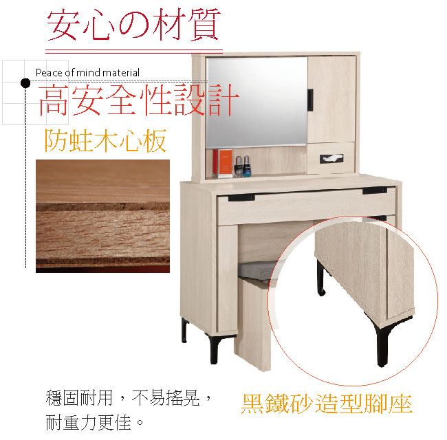 材質 | ◆產品名稱: 【綠家居】柏麗 開合式2.7尺鏡台/化妝台組合(鏡台+化妝椅) 產品尺寸: 尺寸:(寬)80x(深)40x(高)136/公分 ◆材質: 材質:防蛀木心板+黑鐵砂腳座 材質:五金滑軌結構+強化玻璃鏡面 塗漆:優利坦全包式耐磨噴漆處理