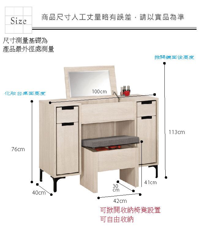 材質 | ◆產品名稱: 【綠家居】柏麗 上掀式2.7尺鏡台/化妝台組合(鏡台+化妝椅) 產品尺寸: 尺寸:(寬)100x(深)40x(高)76-113/公分 ◆材質: 材質:防蛀木心板+黑鐵砂腳座 材質:五金滑軌結構+強化玻璃鏡面 塗漆:優利坦全包式耐磨噴漆處理