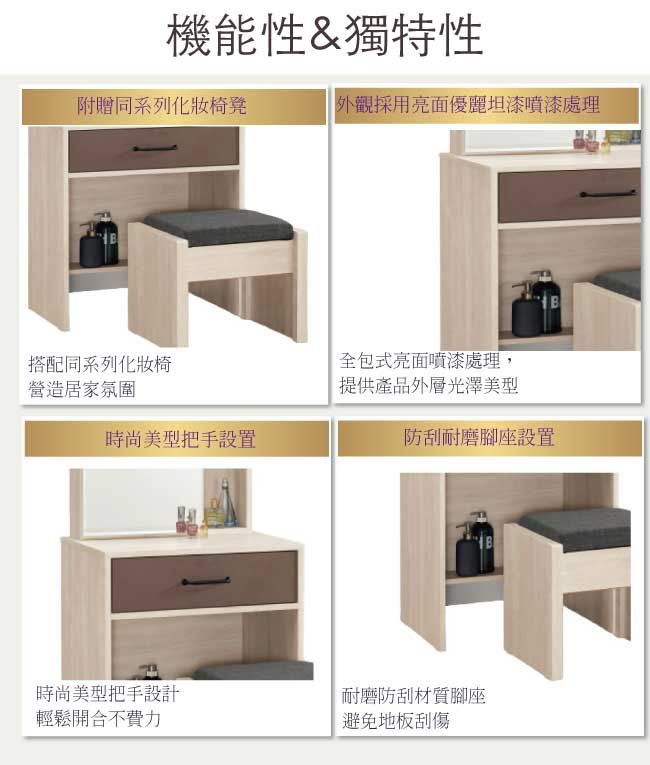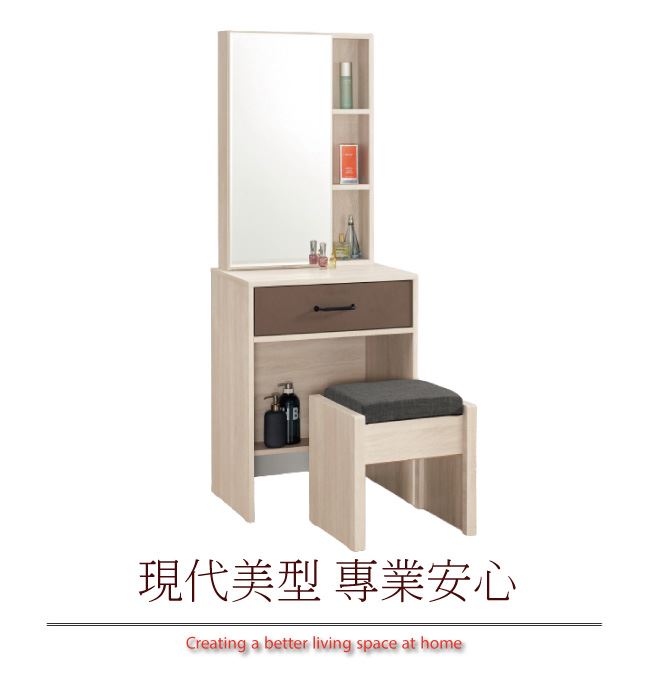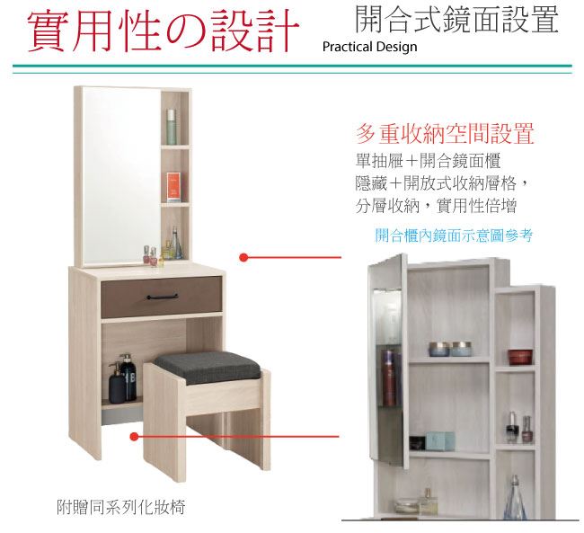 商品介紹 | 【綠家居】古斯漢 開合式2尺鏡台/化妝台組合(鏡台+化妝椅) 橡木紋雙色系+現代簡約風格+安心材質製造,鏡台整體採用防蛀木心板+五金滑軌結構+強化玻璃鏡面+防潮耐磨腳座等安心材質製造,外層採用優利坦全包式耐磨噴漆處理搭配開合式鏡面櫃+開門櫃+單抽屜+開放&隱藏式收納等收納設計,全由專人配送到家,專業安心服務,替你省下更多時間! 【商品特色】 橡木紋雙色系+現代簡約風格+安心材質製造,使用放心+搭配居家更便利 鏡台採用防蛀木心板+五金滑軌結構+強化玻璃鏡面+防潮耐磨腳座等安心材質製造 開合式鏡面櫃+開門櫃+單抽屜+開放&隱藏式收納等收納設計 此商品不需要DIY組立,此商品為組立後之成品 品質保證、專業設計、貼心服務 全由專人配送到家,專業安心服務,替您省下更多時間 |