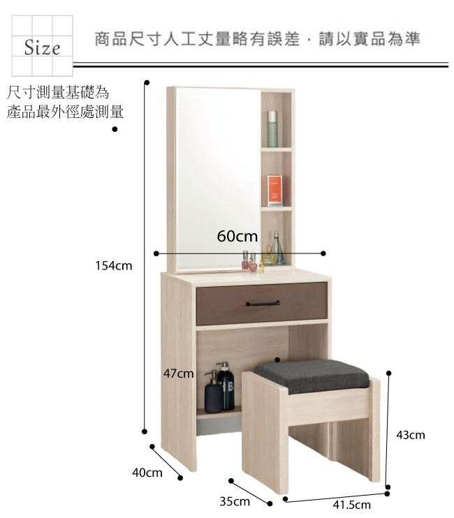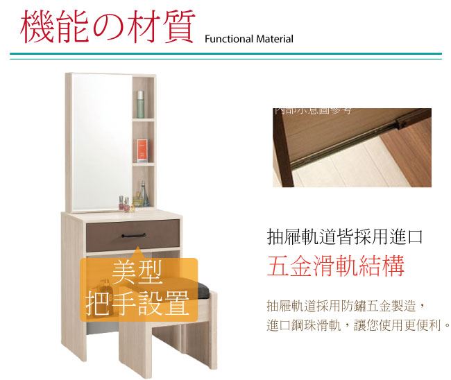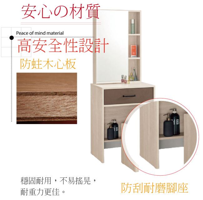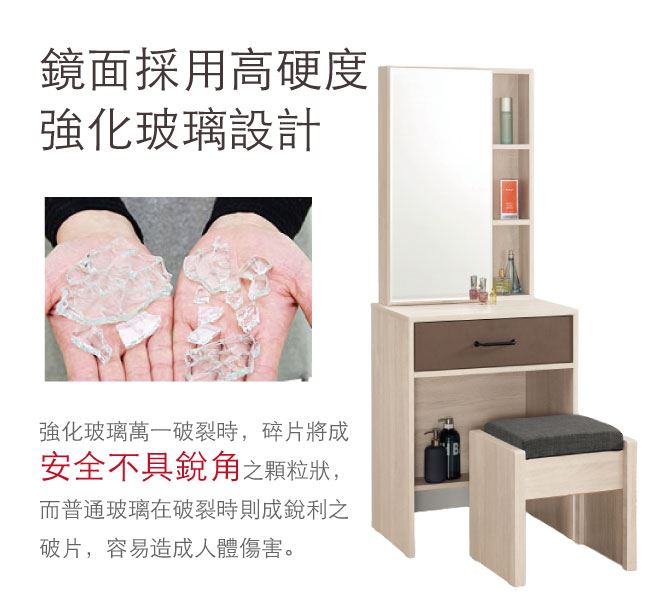 材質 | ◆產品名稱: 【綠家居】古斯漢 開合式2尺鏡台/化妝台組合(鏡台+化妝椅) 產品尺寸: 尺寸:(寬)60x(深)40x(高)154/公分 ◆材質: 材質:防蛀木心板+防潮耐磨腳座 材質:五金滑軌結構+強化玻璃鏡面 塗漆:優利坦全包式耐磨噴漆處理