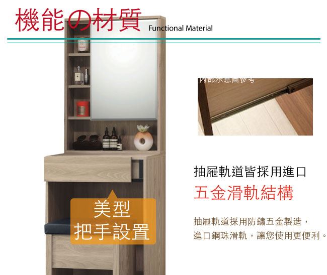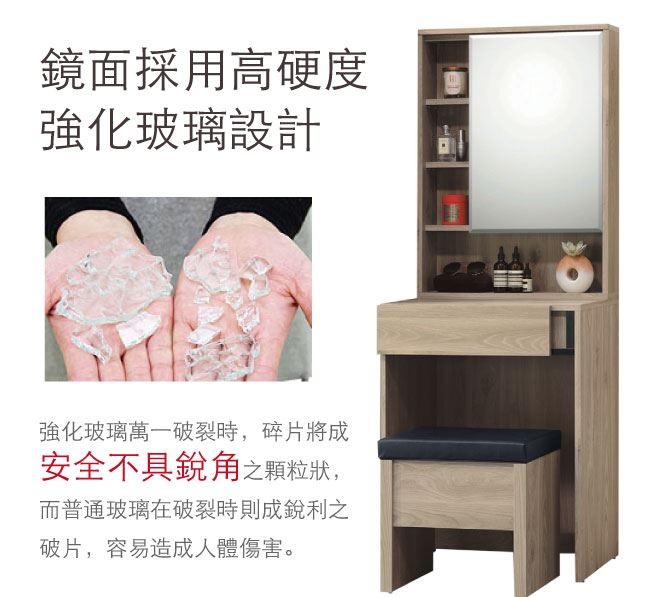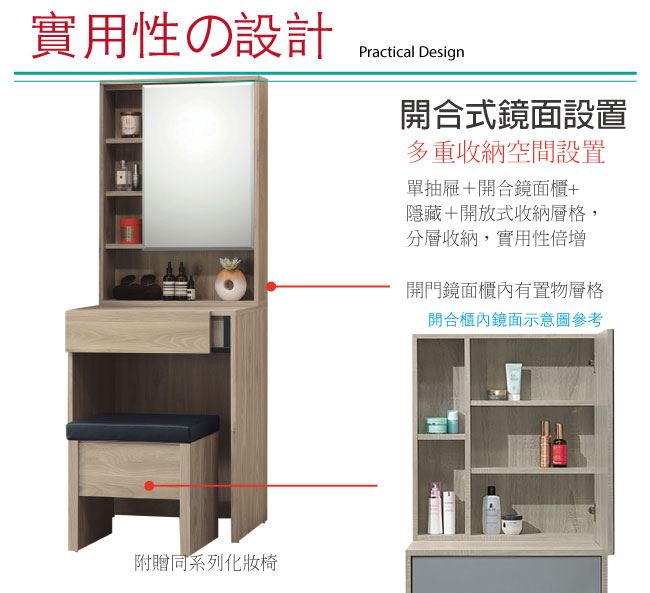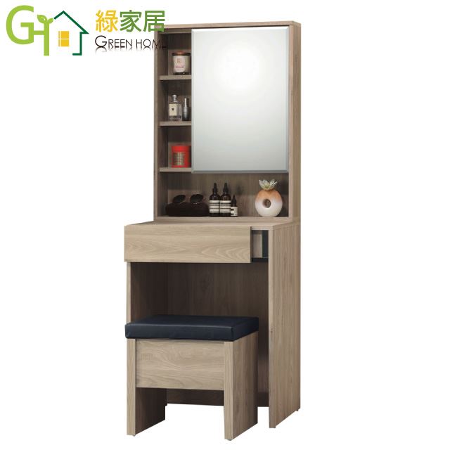 商品介紹 | 【綠家居】歐妮 時尚2尺開合式鏡台/化妝台組合(含化妝椅) 橡木紋雙色系+現代簡約風格+安心材質製造,鏡台整體採用防蛀木心板+五金滑軌結構+強化玻璃鏡面+防潮耐磨腳座等安心材質製造,外層採用優利坦全包式耐磨噴漆處理搭配開合式鏡面櫃+單抽屜+開合櫃+開放式&隱藏式收納等收納設計,全由專人配送到家,專業安心服務,替你省下更多時間! 【商品特色】 橡木紋雙色系+現代簡約風格+安心材質製造,使用放心+搭配居家更便利 鏡台採用防蛀木心板+五金滑軌結構+強化玻璃鏡面+防潮耐磨腳座等安心材質製造 開合式鏡面櫃+單抽屜+開合櫃+開放式&隱藏式收納等收納設計 此商品不需要DIY組立,此商品為組立後之成品 品質保證、專業設計、貼心服務 全由專人配送到家,專業安心服務,替您省下更多時間 |