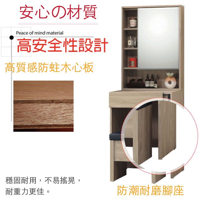 材質 | ◆產品名稱: 【綠家居】歐妮 時尚2尺開合式鏡台/化妝台組合(含化妝椅) 產品尺寸: 尺寸:(寬)60x(深)42x(高)154/公分 ◆材質: 材質:防蛀木心板+防潮耐磨腳座 材質:五金滑軌結構+強化玻璃鏡面 塗漆:優利坦全包式耐磨噴漆處理