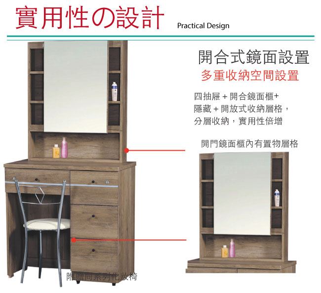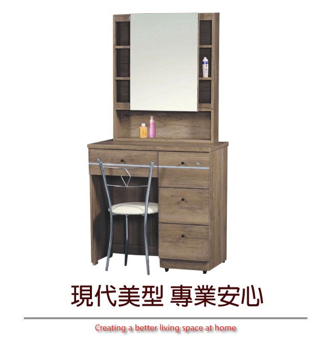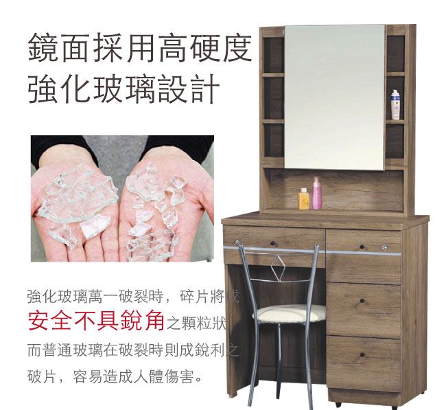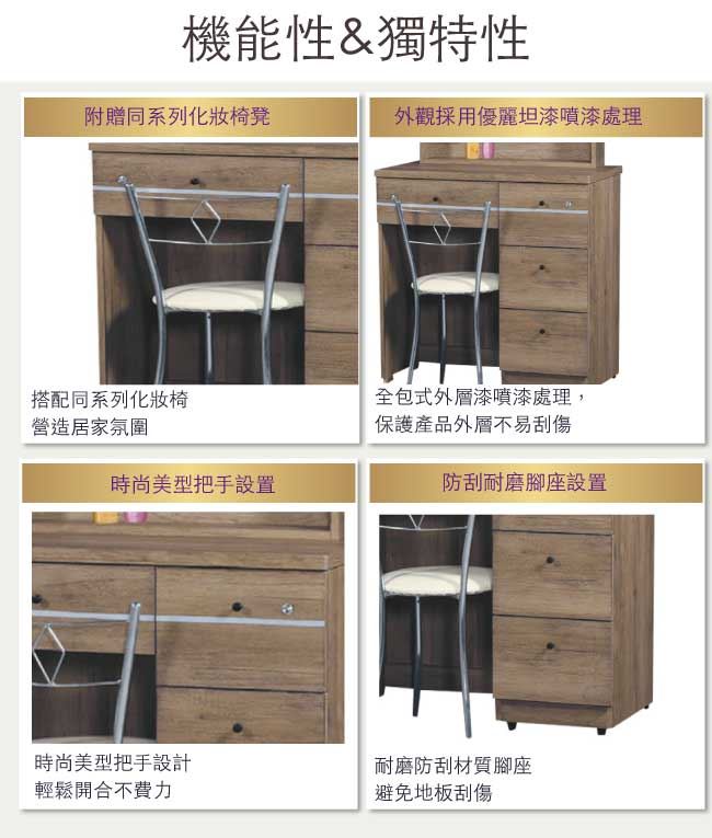 商品 介紹 | 【綠家居】查莫 開合式鏡台/化妝台組合(含化妝椅) 橡木紋色+現代簡約風格+安心材質製造,鏡台整體採用防蛀木心板+五金滑軌結構+強化玻璃鏡面+防潮耐磨腳座等安心材質製造,外層採用優利坦全包式耐磨噴漆處理搭配固定式鏡面+四抽屜+開放式收納等收納設計,全由專人配送到家,專業安心服務,替你省下更多時間! 【商品特色】 橡木紋色+現代簡約風格+安心材質製造,使用放心+搭配居家更便利 鏡台採用防蛀木心板+五金滑軌結構+強化玻璃鏡面+防潮耐磨腳座等安心材質製造 開合式鏡面櫃+四抽屜+開放式收納等收納設計 此商品不需要DIY組立,此商品為組立後之成品 品質保證、專業設計、貼心服務 全由專人配送到家,專業安心服務,替您省下更多時間 |