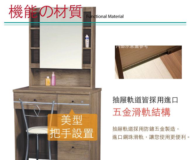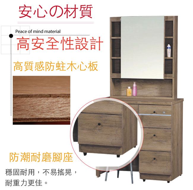 材質 | ◆產品名稱: 【綠家居】查莫 開合式鏡台/化妝台組合(含化妝椅) 產品尺寸: 尺寸:(寬)80x(深)40x(高)158/公分 ◆材質: 材質:防蛀木心板+防潮耐磨腳座 材質:五金滑軌結構+強化玻璃鏡面 塗漆:優利坦全包式耐磨噴漆處理