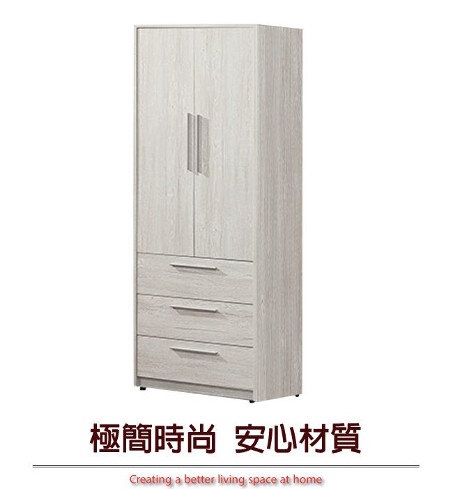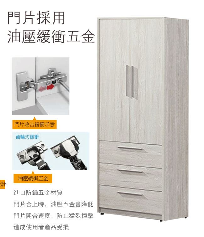 商品 介紹 | 【綠家居】巴菲 淺橡2.7尺二門三抽高衣櫃 淺橡木紋色系+現代簡約風格+安心材質製造,整體採用防蛀木心板+防夾手緩衝門片五金+五金滑軌結構+防潮耐磨腳座等安心材質製造,外層採用優利坦全包式耐磨噴漆處理搭配吊衣桿+開門櫃+三抽屜+內開放式層格等收納設計,全由專人配送到家,專業安心服務,替你省下更多時間! 【商品特色】 淺橡木紋色系+現代簡約風格+安心材質製造,使用放心+搭配居家更便利 採用防蛀木心板+防夾手緩衝門片五金+五金滑軌結構+防潮耐磨腳座等安心材質製造 吊衣桿+開門櫃+三抽屜+內開放式層格等收納設計 此商品不需要DIY組立,此商品為組立後之成品 品質保證、專業設計、貼心服務 全由專人配送到家,專業安心服務,替您省下更多時間 |