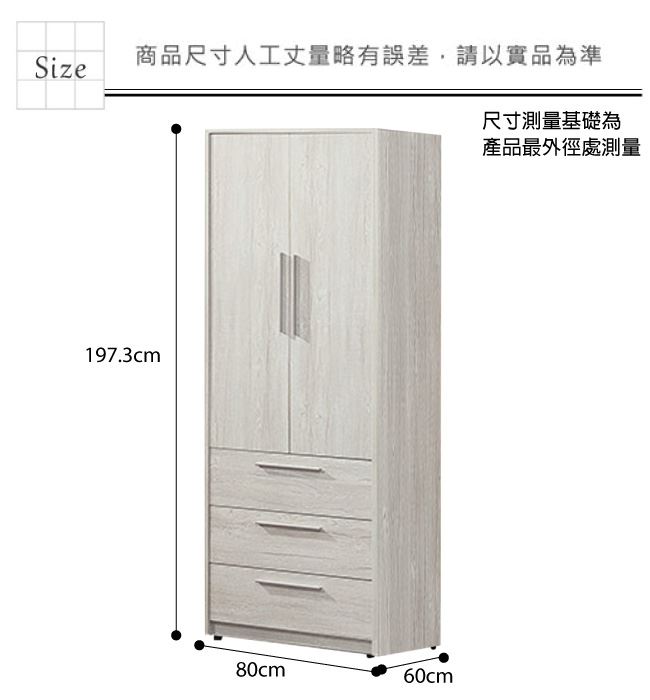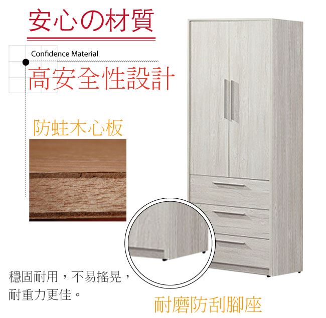 材質 | ◆產品名稱: 【綠家居】巴菲 淺橡2.7尺二門三抽高衣櫃 產品尺寸: 尺寸:(寬)80x(深)60x(高)197.3/公分 ◆材質: 材質:防蛀木心板+防潮耐磨腳座 材質:防夾手緩衝門片五金+五金滑軌結構 塗漆:優利坦全包式耐磨噴漆處理