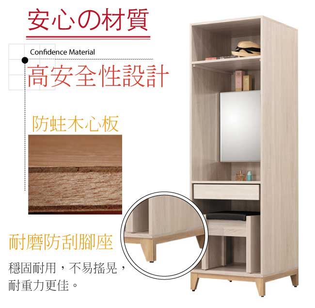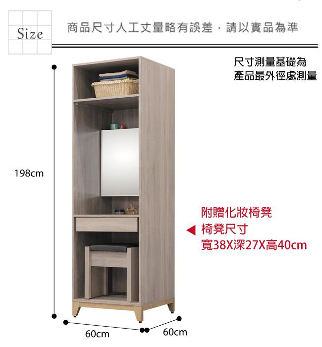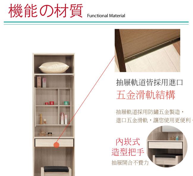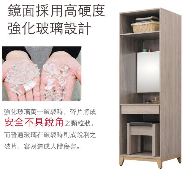 材質 | ◆產品名稱: 【綠家居】查德 時尚2尺化妝鏡面衣櫃/高化妝台(二色可選+含化妝椅) 產品尺寸: 尺寸:(寬)60x(深)60x(高)198/公分 ◆材質: 材質:防蛀木心板+防潮耐磨腳座 材質:五金滑軌結構+強化玻璃鏡面 塗漆:優利坦全包式耐磨噴漆處理