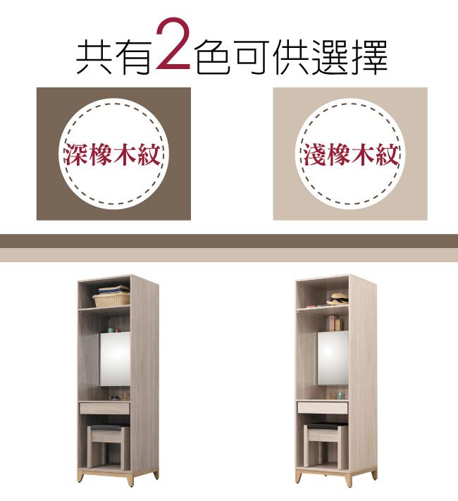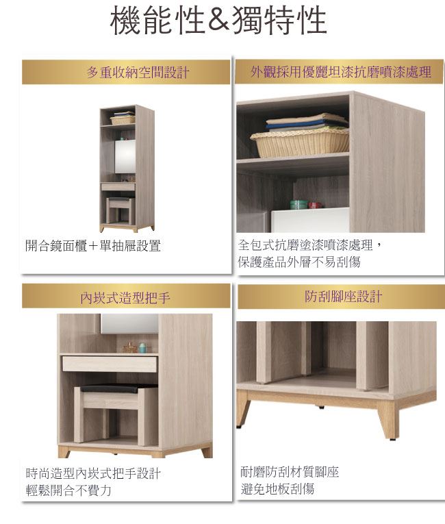 商品 介紹 | 【綠家居】查德 時尚2尺化妝鏡面衣櫃/高化妝台(二色可選+含化妝椅) 二色可選+現代簡約風格+安心材質製造,鏡台整體採用防蛀木心板+五金滑軌結構+強化玻璃鏡面+防潮耐磨腳座等安心材質製造,外層採用優利坦全包式耐磨噴漆處理搭配單抽屜+強化玻璃鏡面櫃+開放式層格+含化妝椅等收納設計,全由專人配送到家,專業安心服務,替你省下更多時間! 【商品特色】 二色可選+現代簡約風格+安心材質製造,使用放心+搭配居家更便利 採用防蛀木心板+五金滑軌結構+強化玻璃鏡面+防潮耐磨腳座等安心材質製造 單抽屜+強化玻璃鏡面櫃+開放式層格+含化妝椅等收納設計 此商品不需要DIY組立,此商品為組立後之成品 品質保證、專業設計、貼心服務 全由專人配送到家,專業安心服務,替您省下更多時間 |