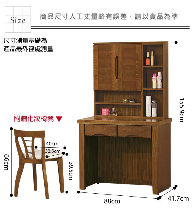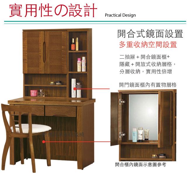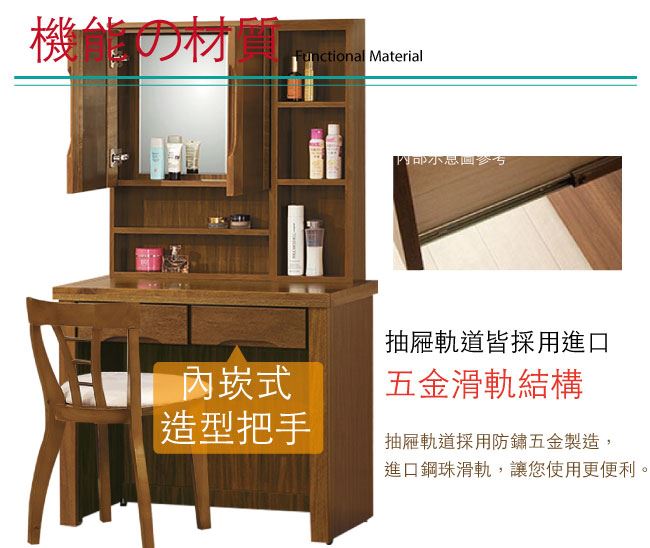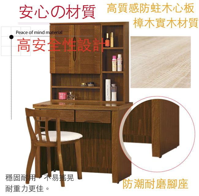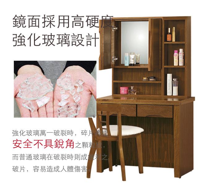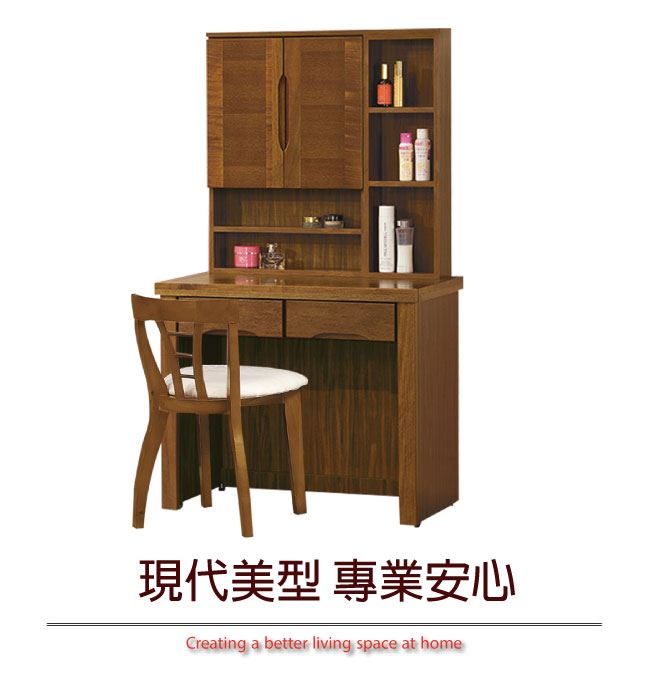商 品 介 紹 | 【綠家居】柏林 時尚2.9尺實木開合式鏡台/化妝台組合(含化妝椅) 樟木紋色系+現代簡約風格+安心材質製造,鏡台整體採用樟木實木+防蛀木心板+五金滑軌結構+強化玻璃鏡面+防刮耐磨腳座等安心材質製造,外層採用優利坦全包式耐磨噴漆處理搭配開合式鏡面櫃+二抽屜+開門櫃+開放式收納等收納設計,全由專人配送到家,專業安心服務,替你省下更多時間! 【商品特色】 樟木紋色系+現代簡約風格+安心材質製造,使用放心+搭配居家更便利 鏡台採用樟木實木+防蛀木心板+五金滑軌結構+強化玻璃鏡面+防刮耐磨腳座等安心材質製造 開合式鏡面櫃+二抽屜+開門櫃+開放式收納等收納設計 此商品不需要DIY組立,此商品為組立後之成品 品質保證、專業設計、貼心服務 全由專人配送到家,專業安心服務,替您省下更多時間 |