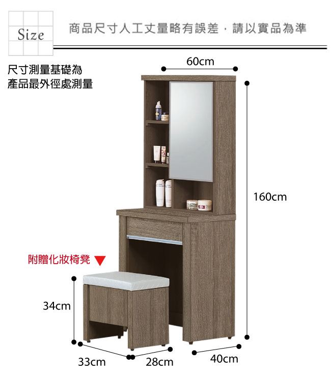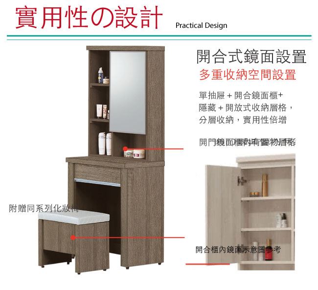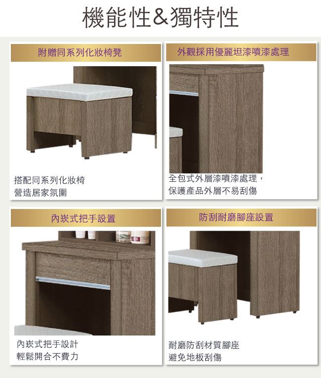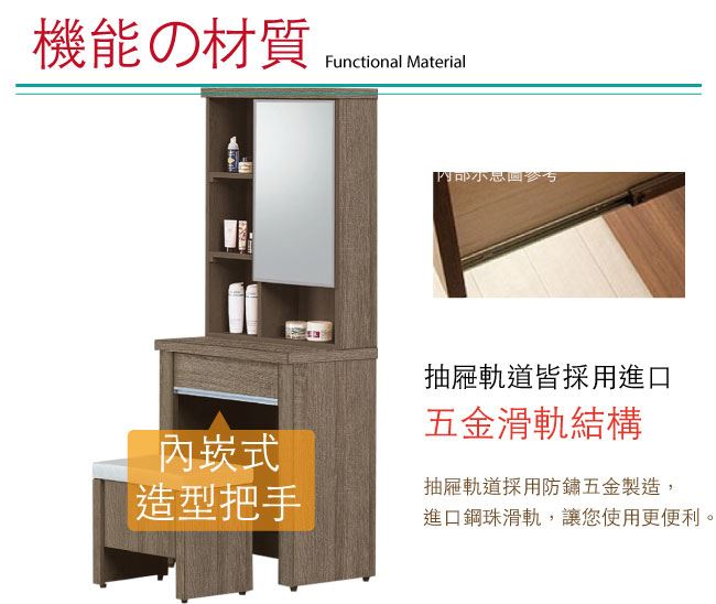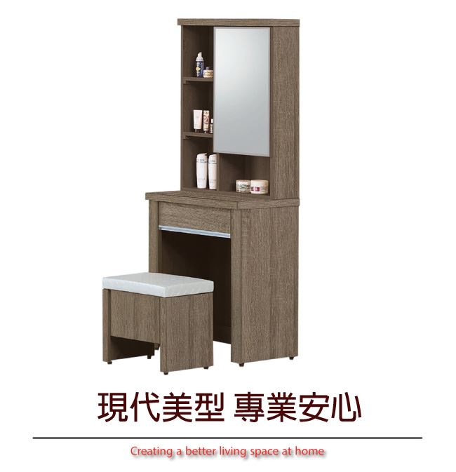 商 品 介 紹 | 【綠家居】格斯 時尚2尺開合式鏡台/化妝台組合(含化妝椅) 深橡木紋色系+現代簡約風格+安心材質製造,鏡台整體採用防蛀木心板+五金滑軌結構+強化玻璃鏡面+防刮耐磨腳座等安心材質製造,外層採用優利坦全包式耐磨噴漆處理搭配開合式鏡面櫃+單抽屜+開放式收納等收納設計,全由專人配送到家,專業安心服務,替你省下更多時間! 【商品特色】 深橡木紋色系+現代簡約風格+安心材質製造,使用放心+搭配居家更便利 鏡台採用防蛀木心板+五金滑軌結構+強化玻璃鏡面+防刮耐磨腳座等安心材質製造 開合式鏡面櫃+單抽屜+開放式收納等收納設計 此商品不需要DIY組立,此商品為組立後之成品 品質保證、專業設計、貼心服務 全由專人配送到家,專業安心服務,替您省下更多時間 |